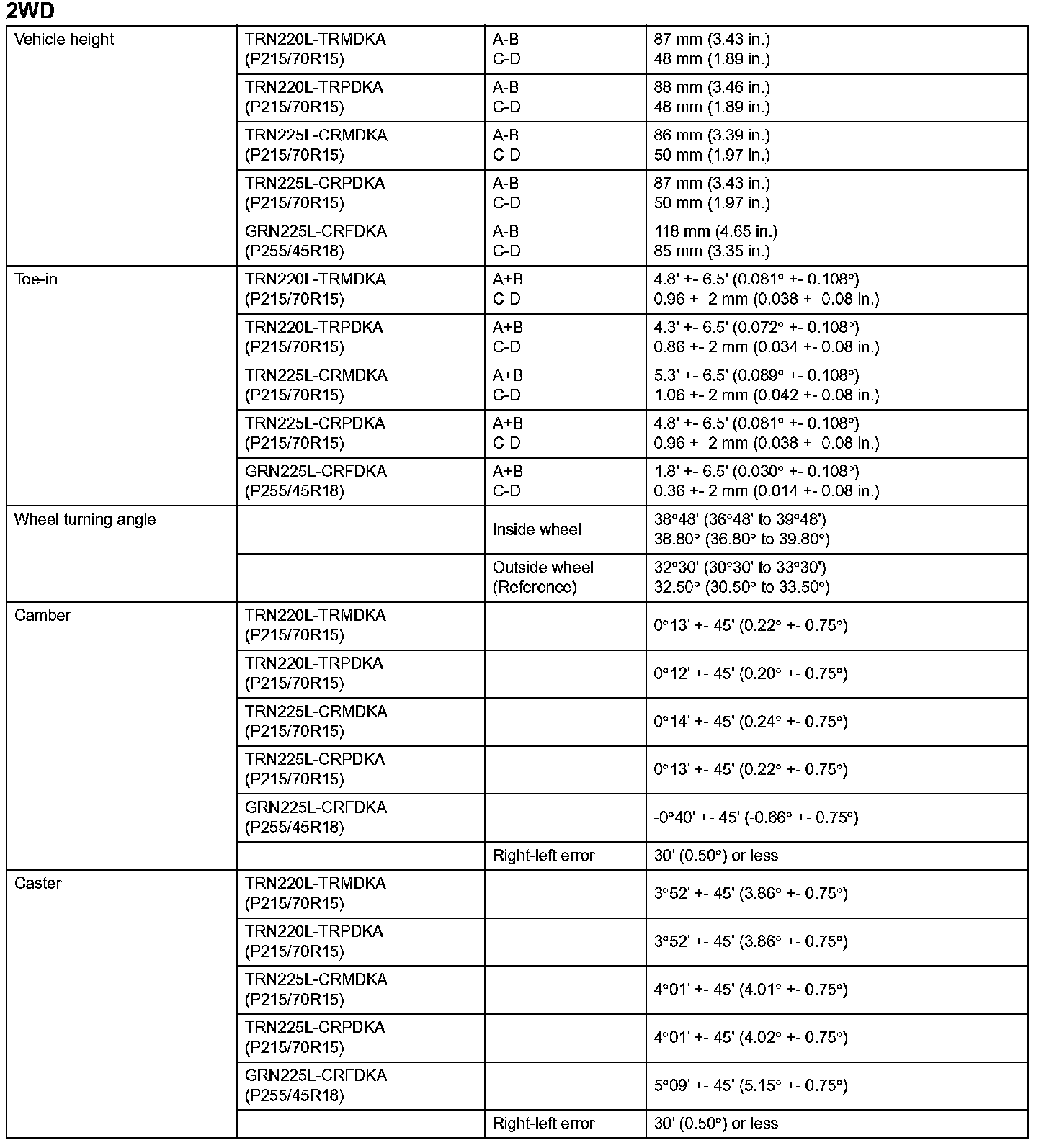 Front Suspension Service Data (2WD):