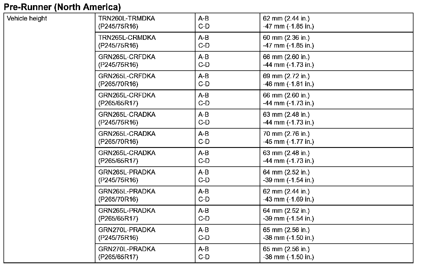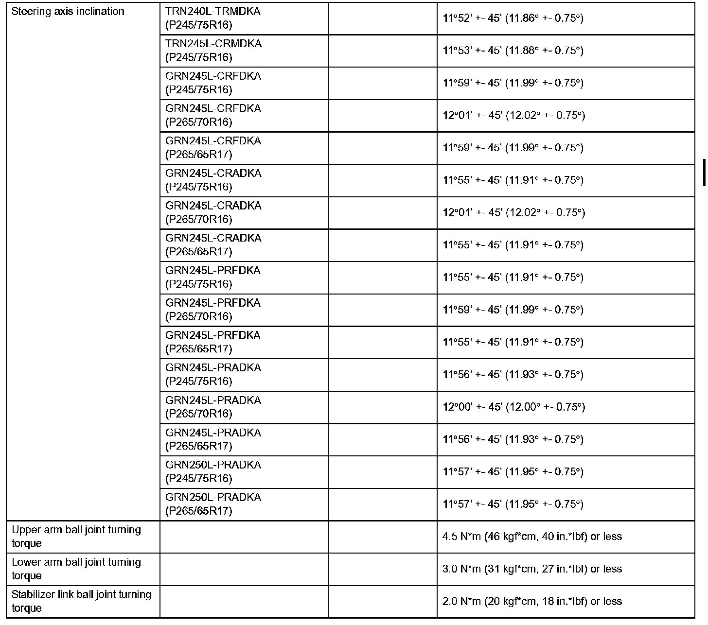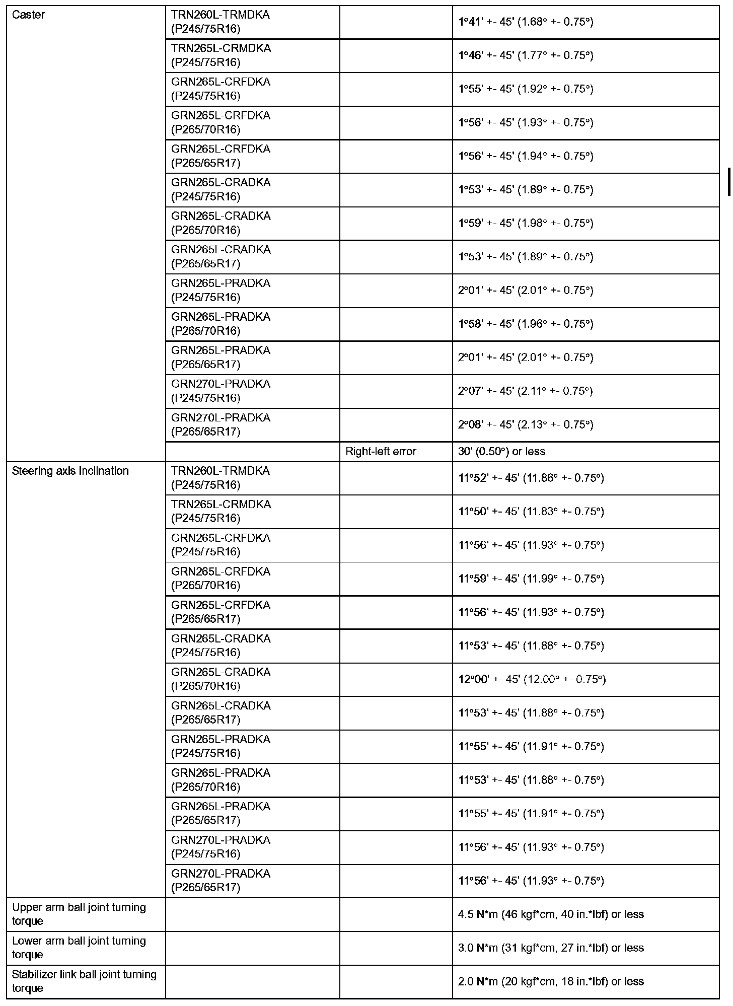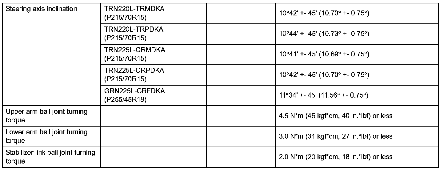 Front Suspension Service Data (PreRunner - North America):