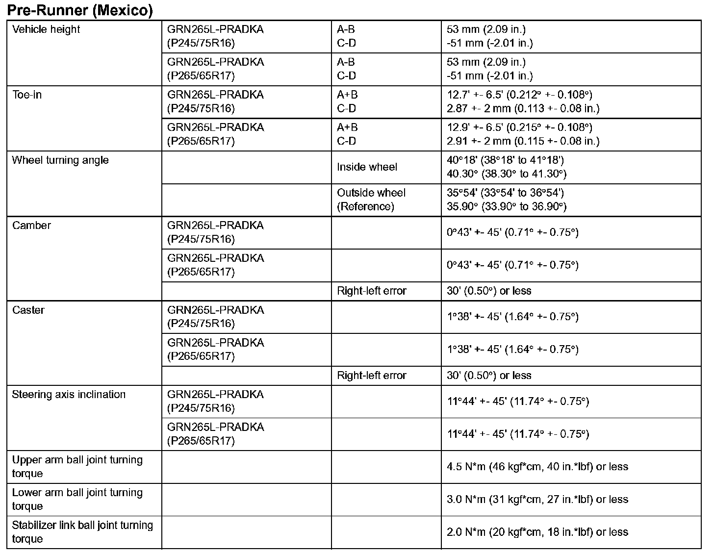 Front Suspension Service Data (PreRunner - Mexico):