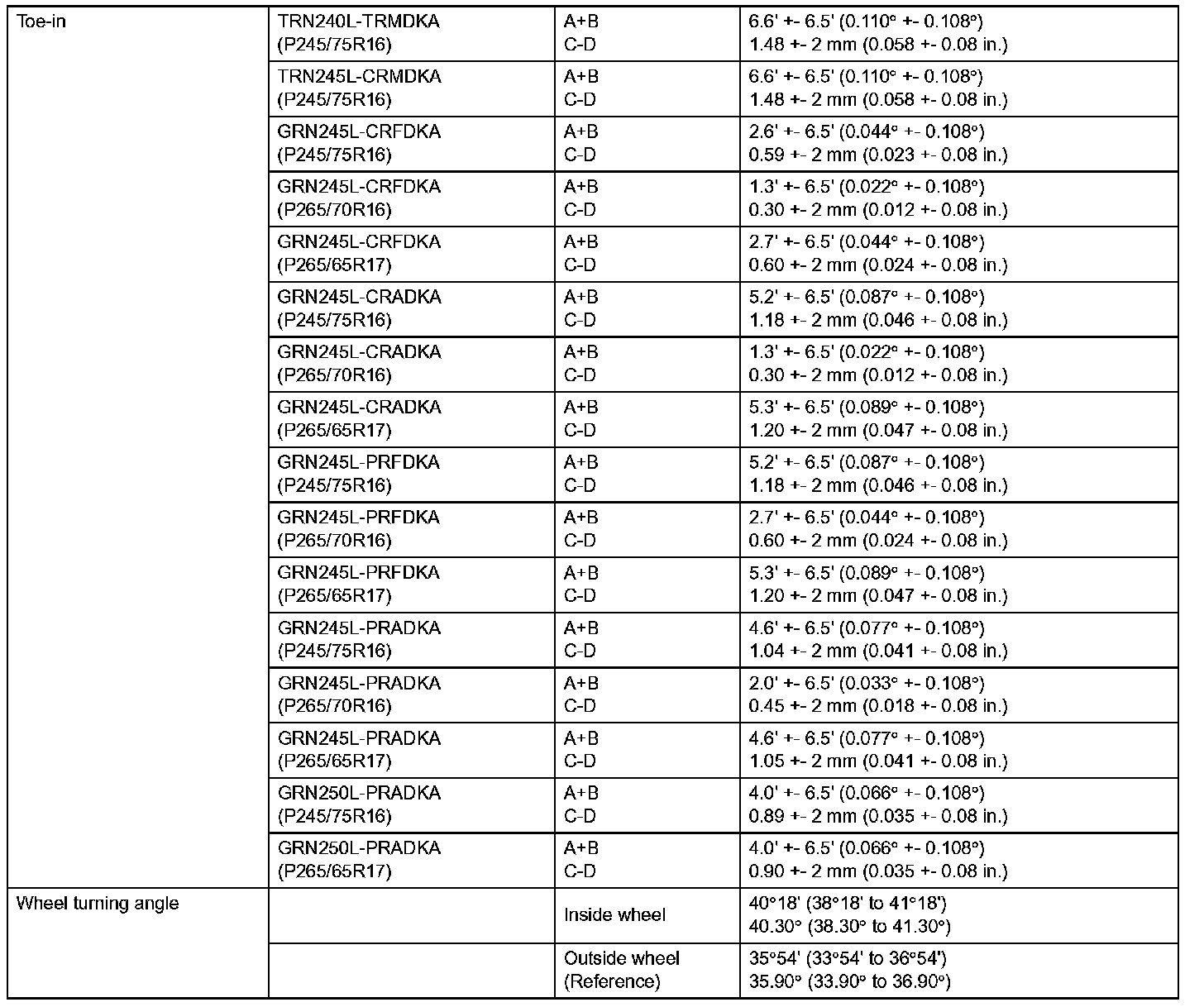 Front Suspension Service Data (4WD):