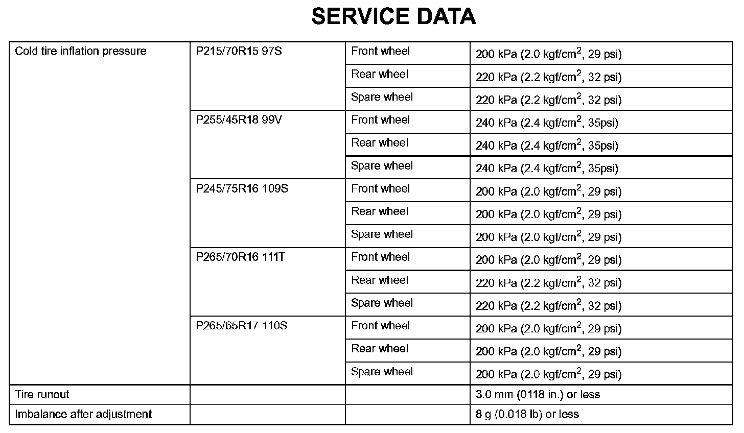 Tire And Wheel - Service Data: