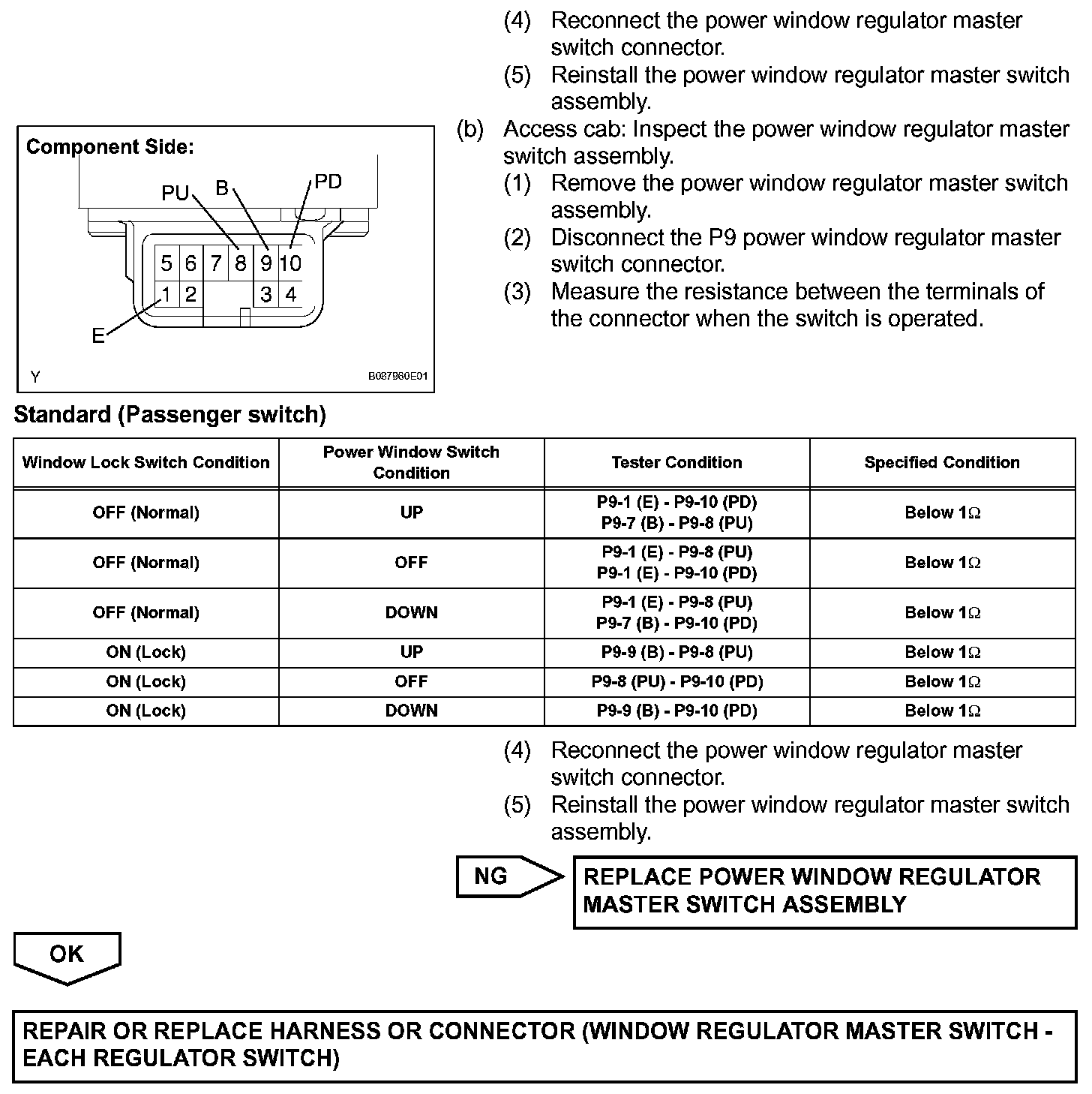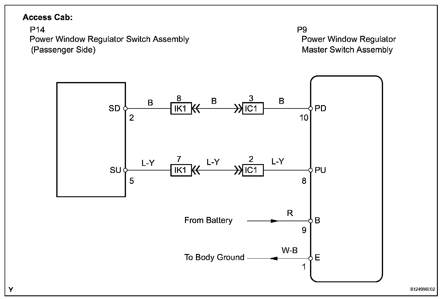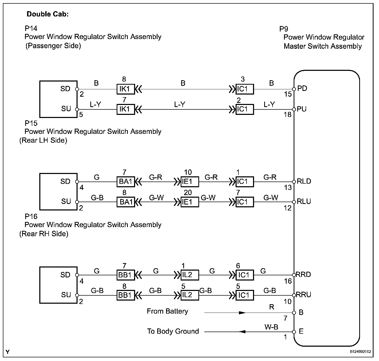 With the ignition switch ON, the power window regulator master switch assembly transmits remote switch signals to the passenger side power window and rear door power window regulator switches. Then, the regulator switches drive the power window regulator motors.