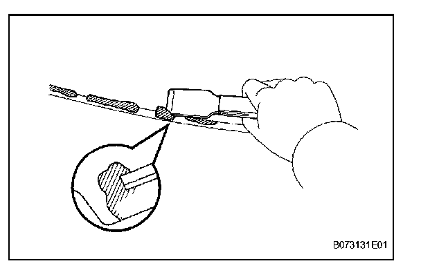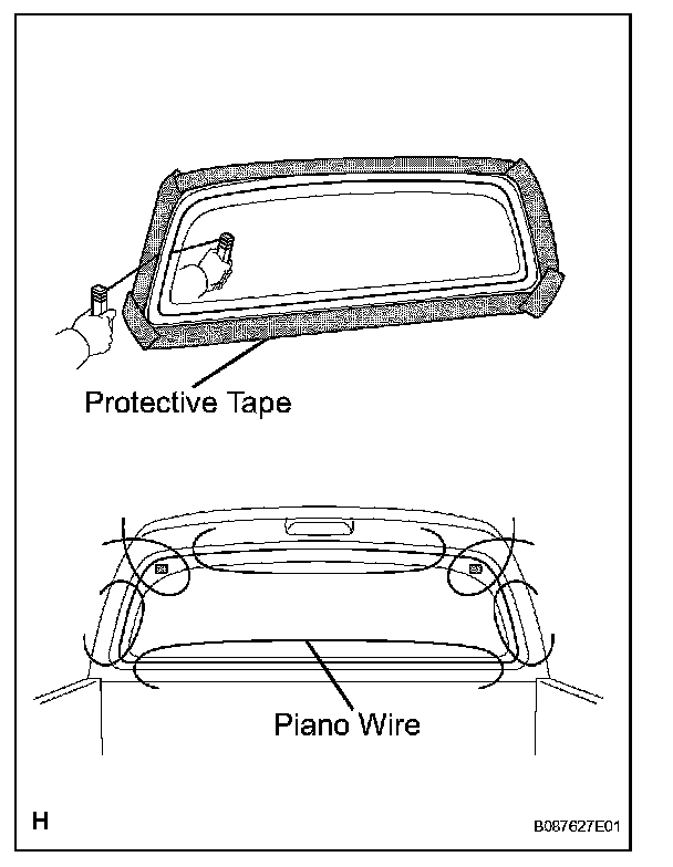 c. From the interior, insert piano wires between the vehicle body and back window, as shown in the illustration.