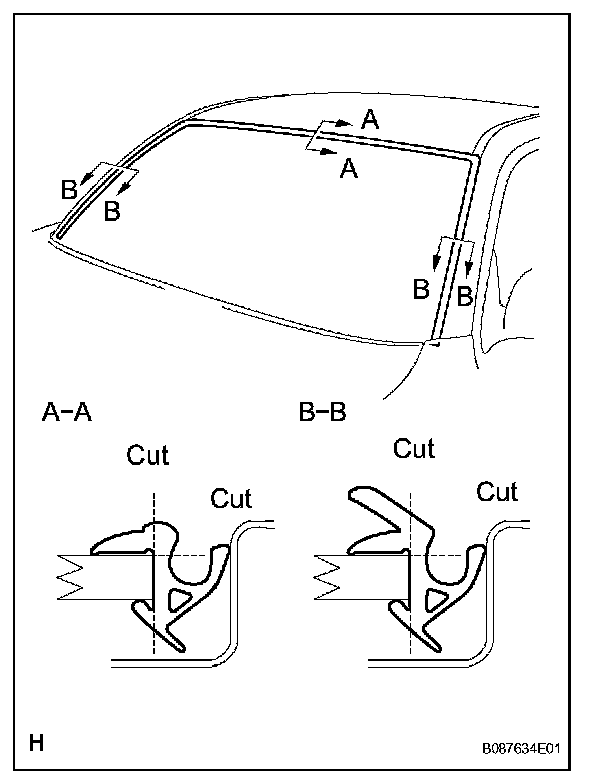 a. Using a knife, cut off the windshield upper moulding outer, as shown in the illustration.