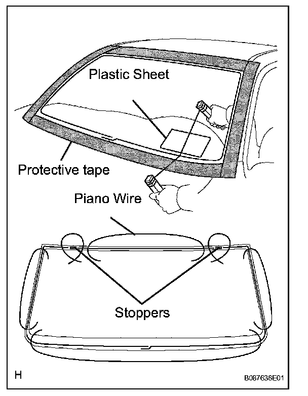b. From the interior, insert piano wires between the vehicle body and windshield glass, as shown in the illustration.