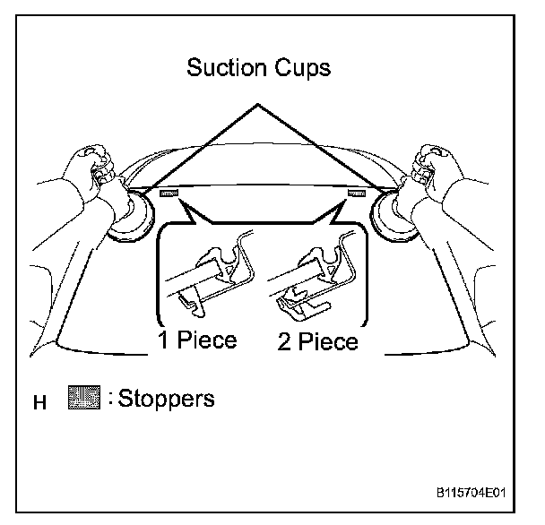 b. Install 2 new stoppers onto the windshield glass, as shown in the illustration.