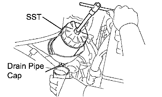(b) While removing the oil filter with SST, catch the oil from the oil filter with a container.