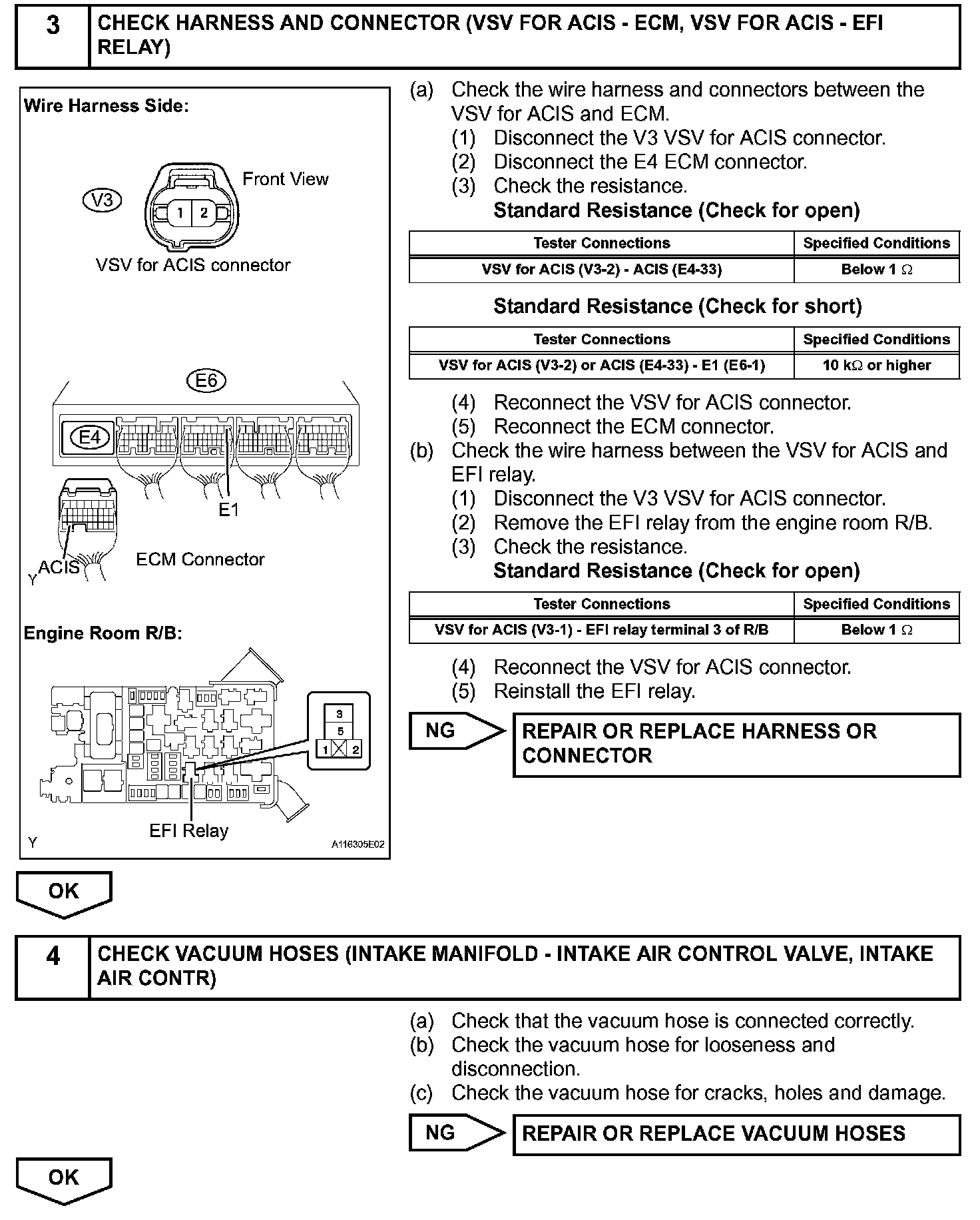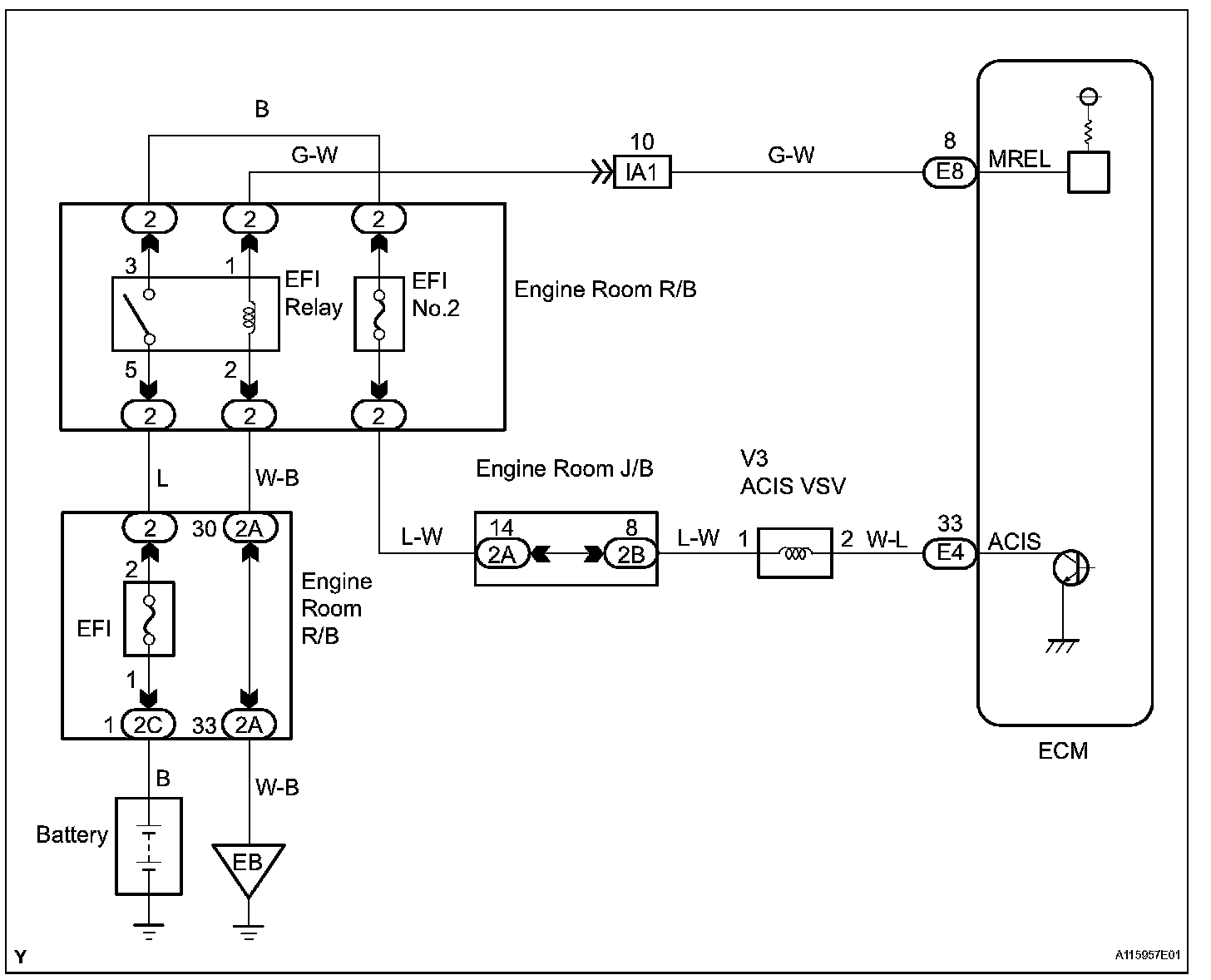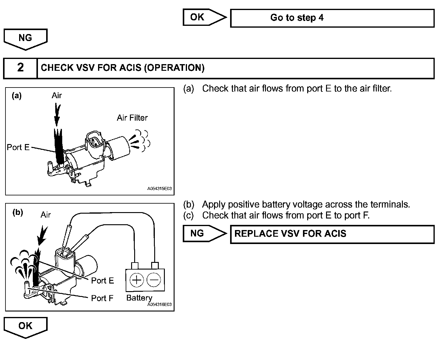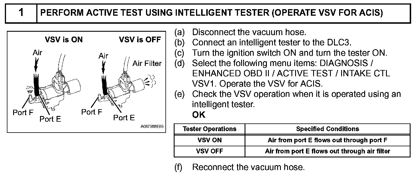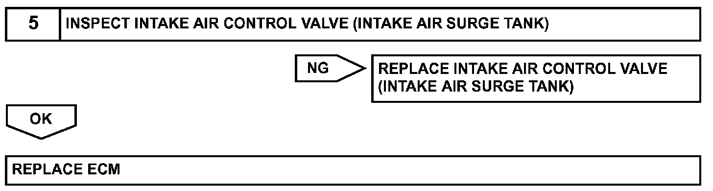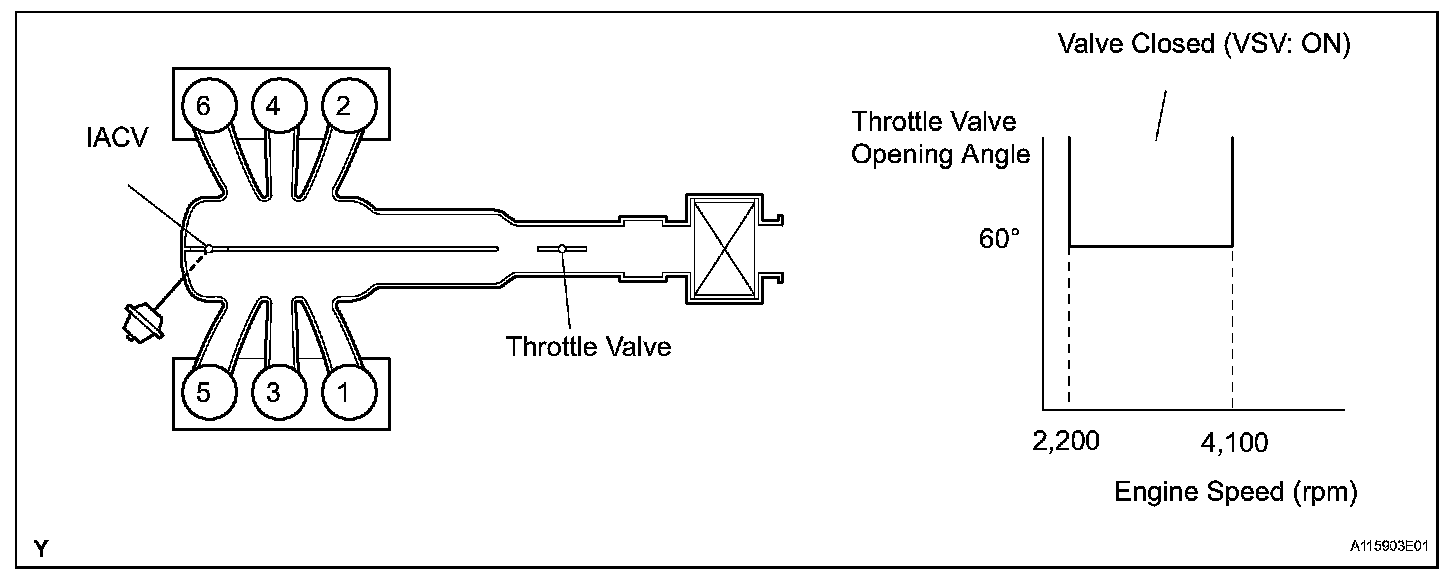 This circuit opens and closes the Intake Air Control Valve (IACV) in response to changes in the engine load in order to increase the intake efficiency (ACIS: Acoustic Control Induction System). When the engine speed is between 2,200 rpm and 4,100 rpm and the throttle valve opening angle is 60° or more, the ECM supplies current to the VSV (ON status), to close the IACV. Under other conditions, the VSV is usually OFF and the IACV is open.