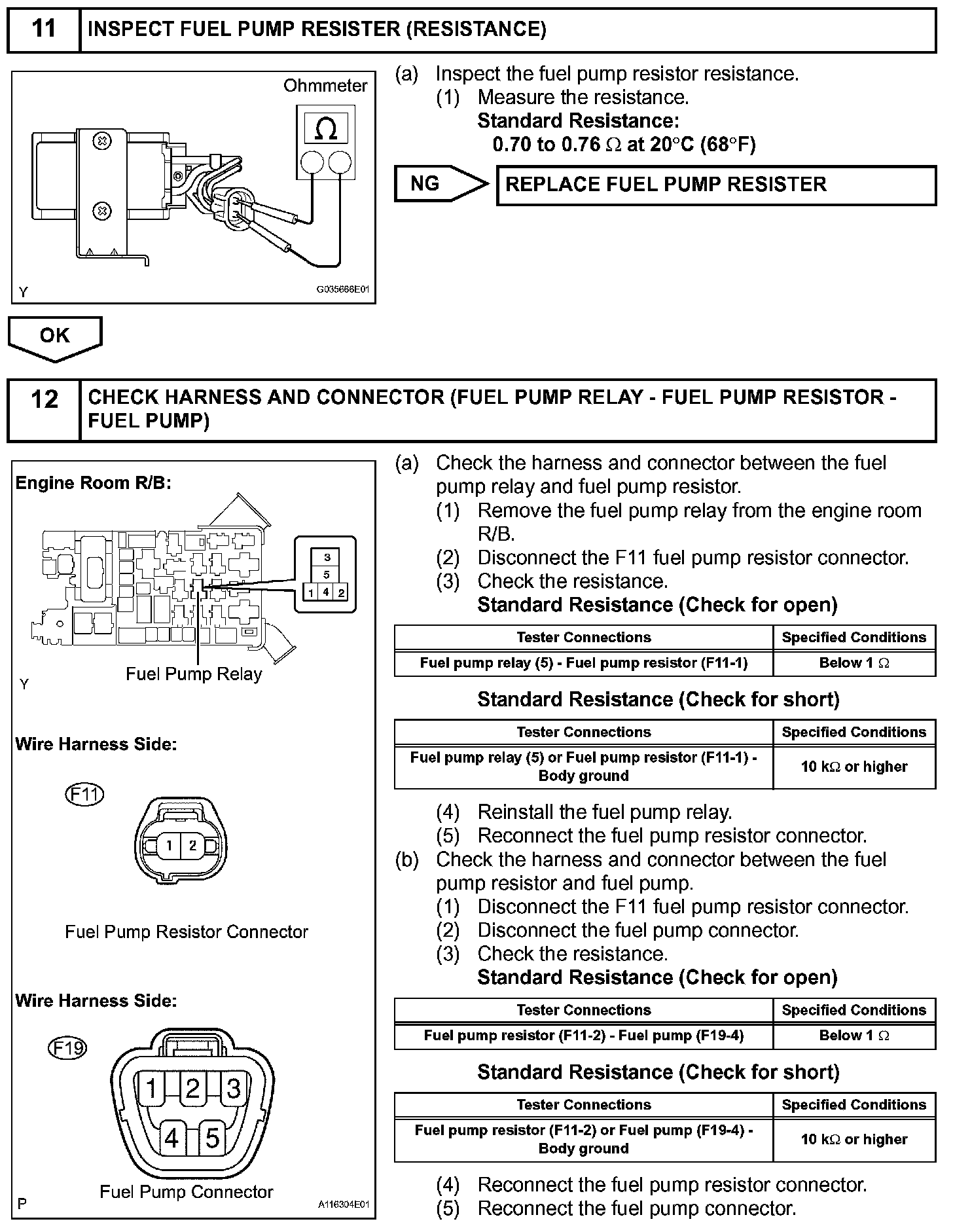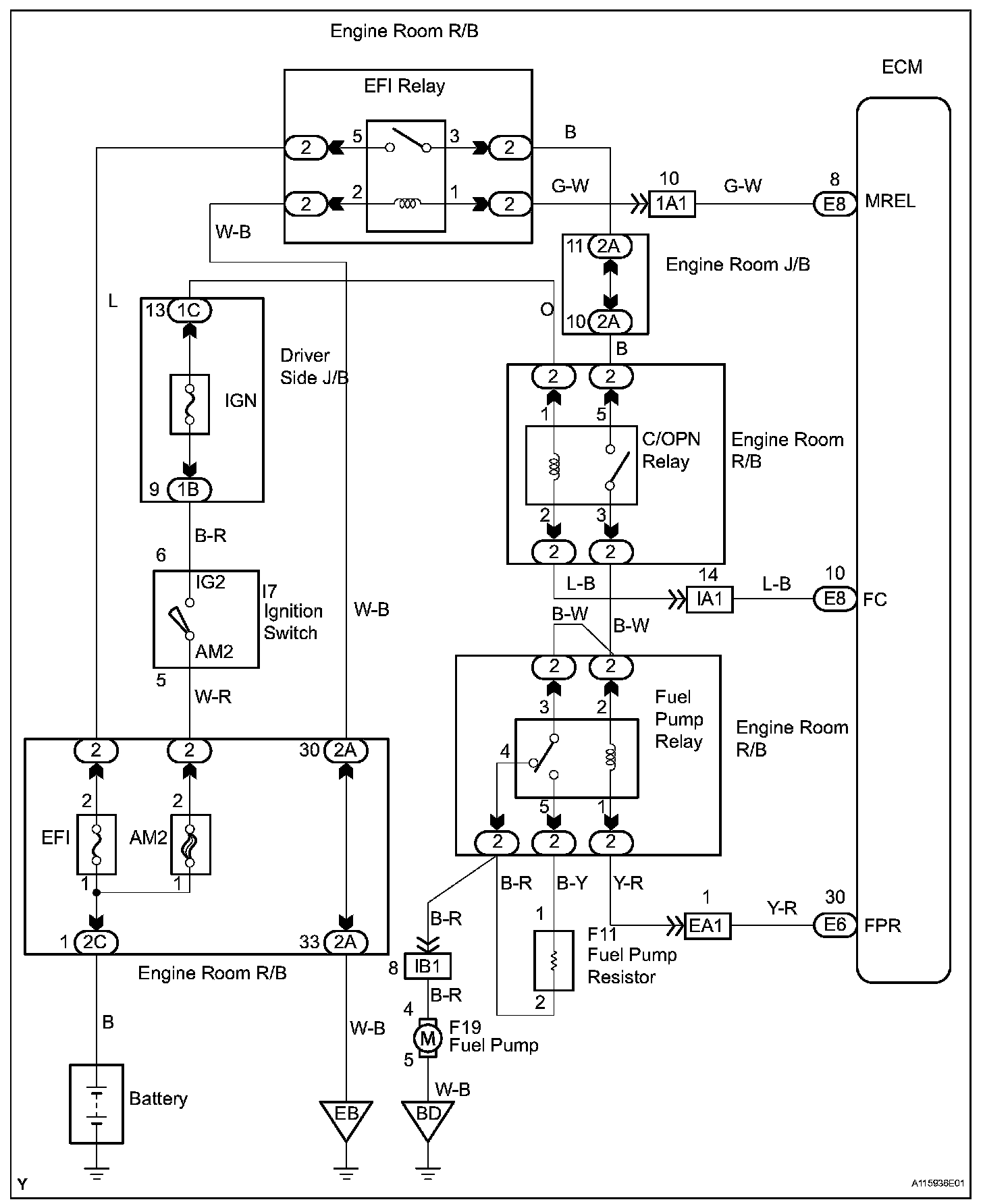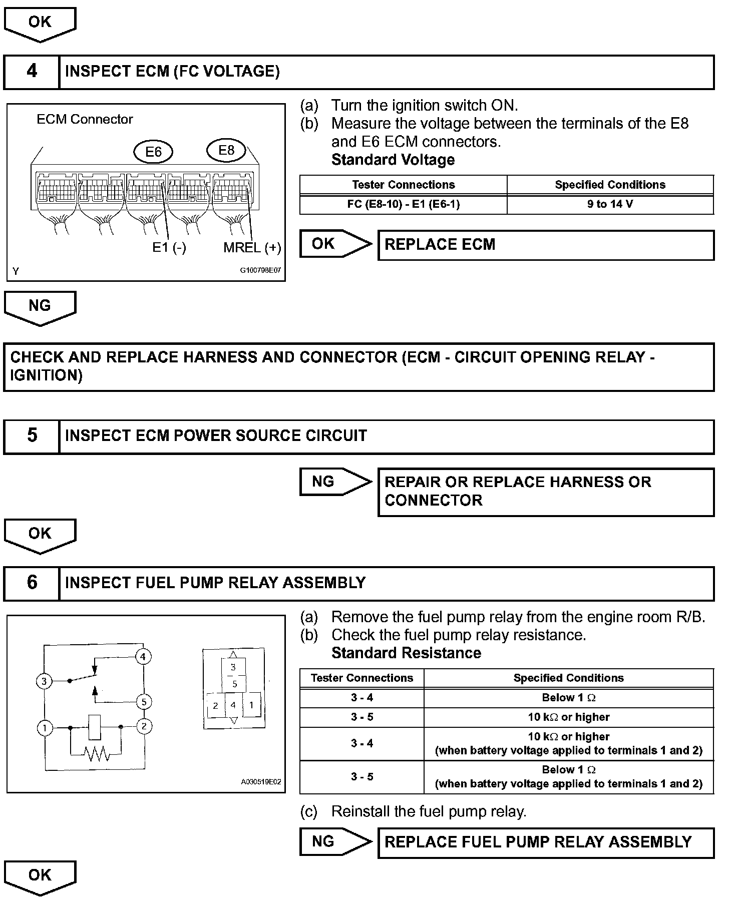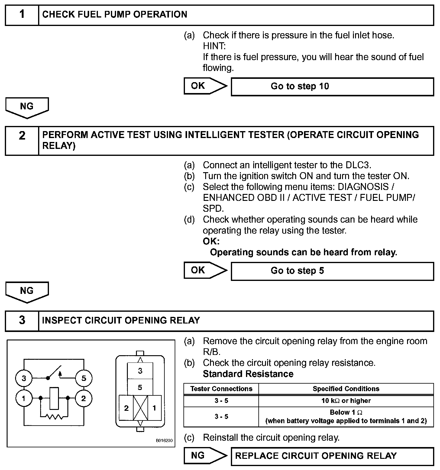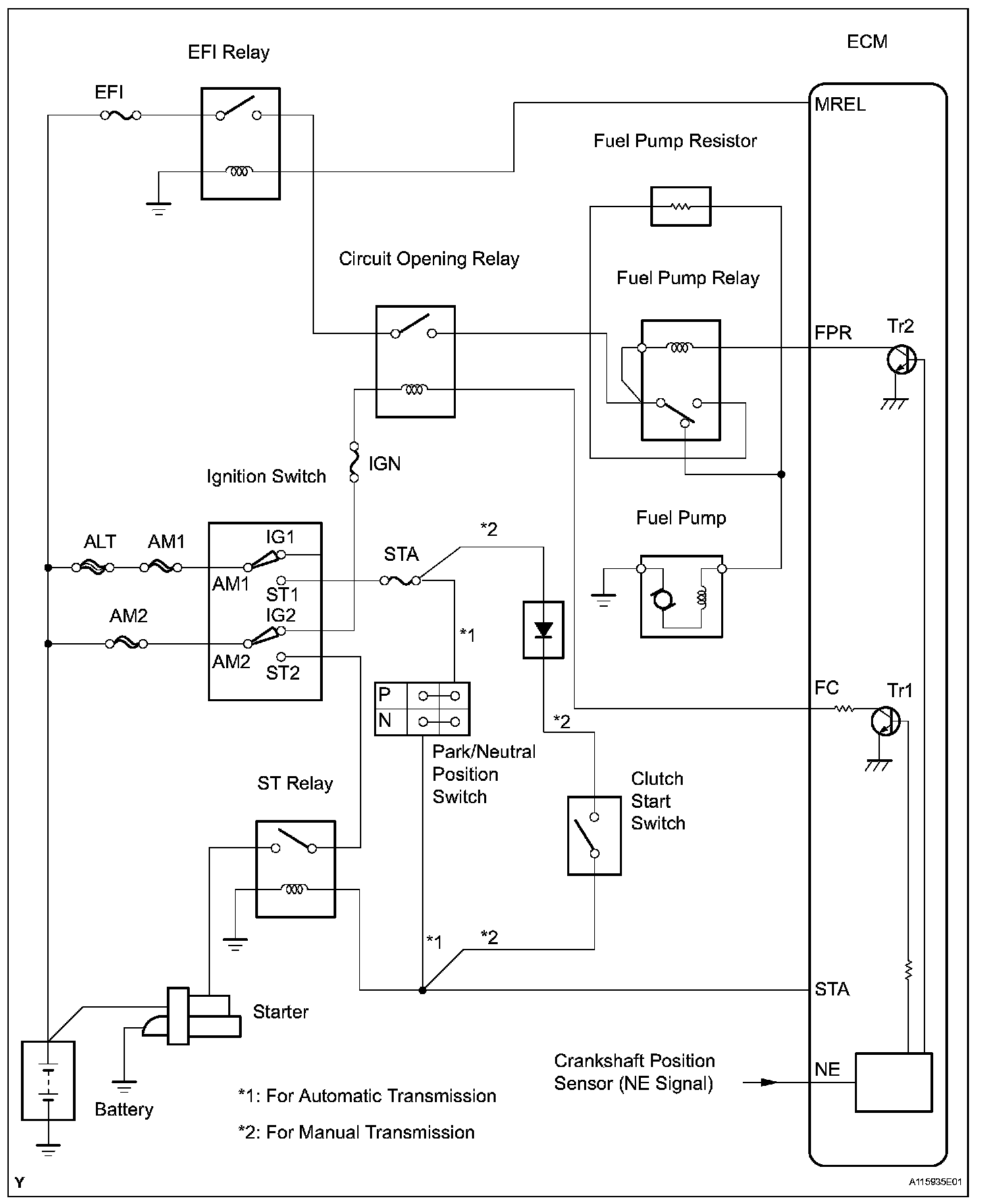 When the STA signal and NE signal are input to the ECM, Tr1 (power transistor 1) is turned ON, current flows to the coil of the circuit opening relay, the relay switches on, power is supplied to the fuel pump, and the fuel pump operates.