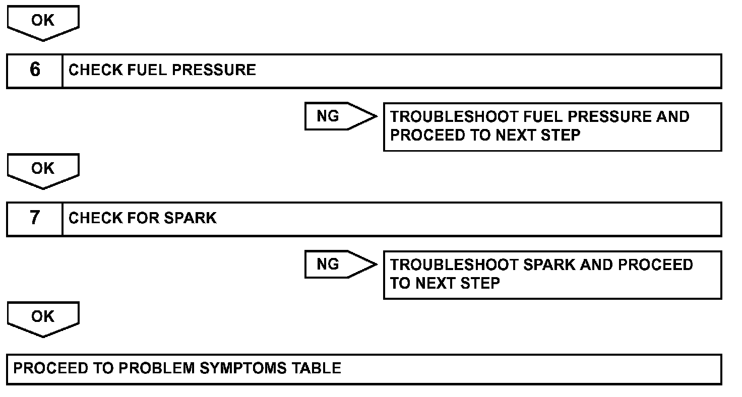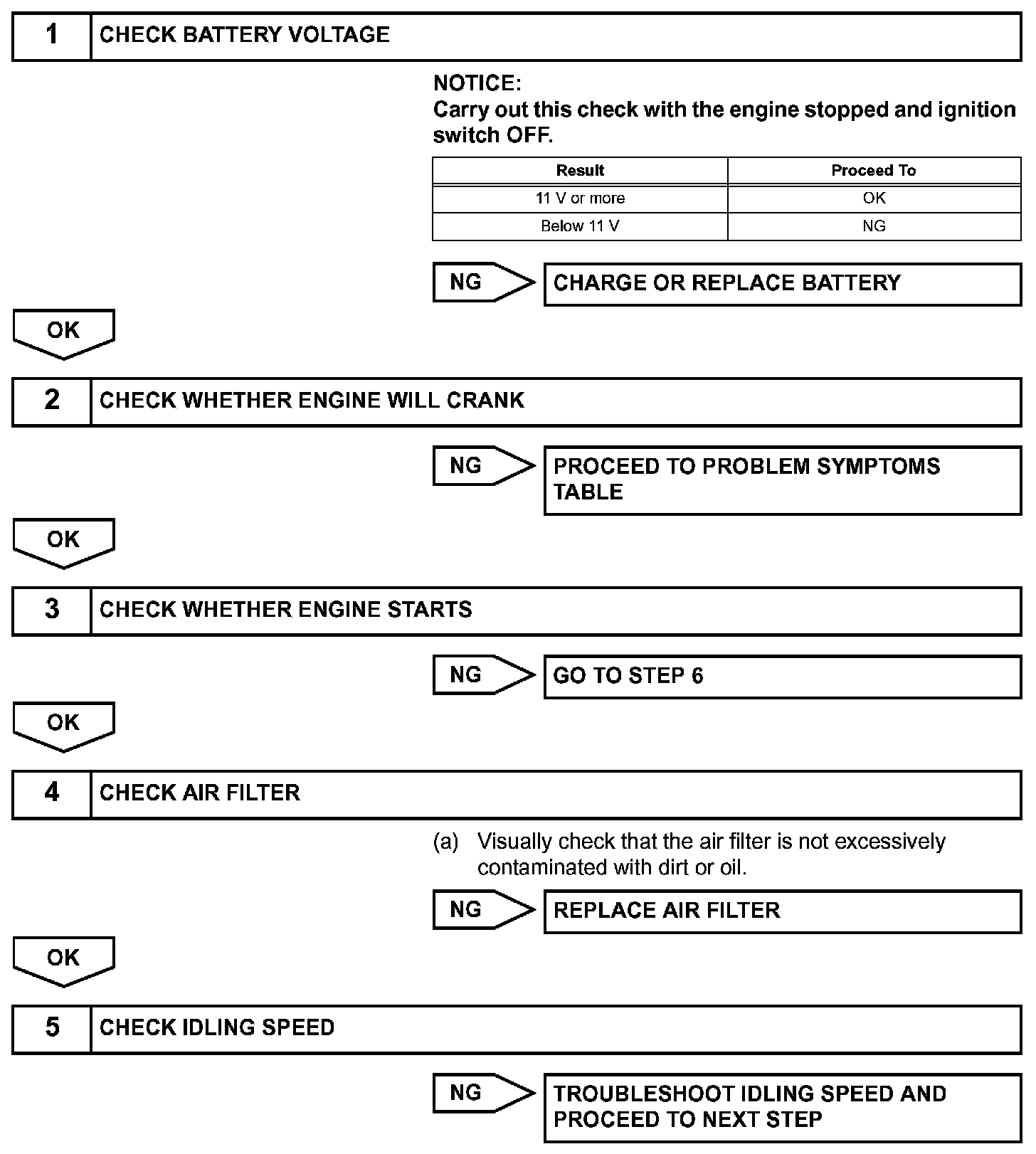 When a malfunction is not confirmed by the DTC check, troubleshooting should be carried out in all circuits considered to be possible causes of the problem. In many cases, by carrying out the basic engine check shown in the flowchart, the location of the problem can be found quickly and efficiently. Therefore, using this check is essential when engine troubleshooting.