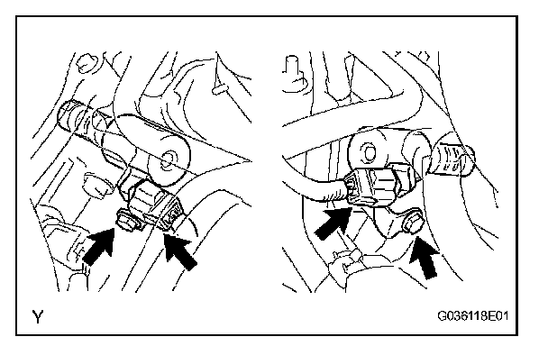 b. Remove the 2 bolts, then remove the 2 camshaft timing oil control valves.