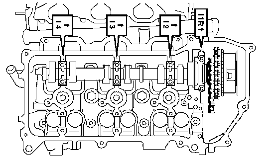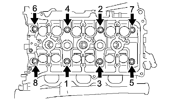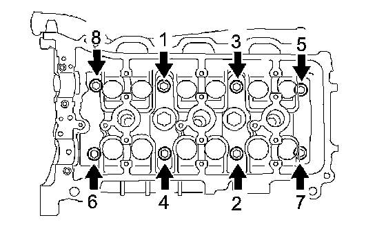 Using several steps, uniformly install and tighten the 8 bearing cap bolts in the sequence shown in the illustration.