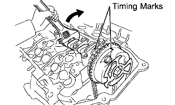 Rotate the No.1 camshaft clockwise using a wrench so that the timing mark of the camshaft timing gear is aligned with the timing mark of the camshaft bearing cap.