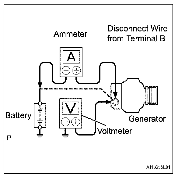1. Disconnect the wire from terminal B of the generator, then connect it to the negative (-) lead of the ammeter.