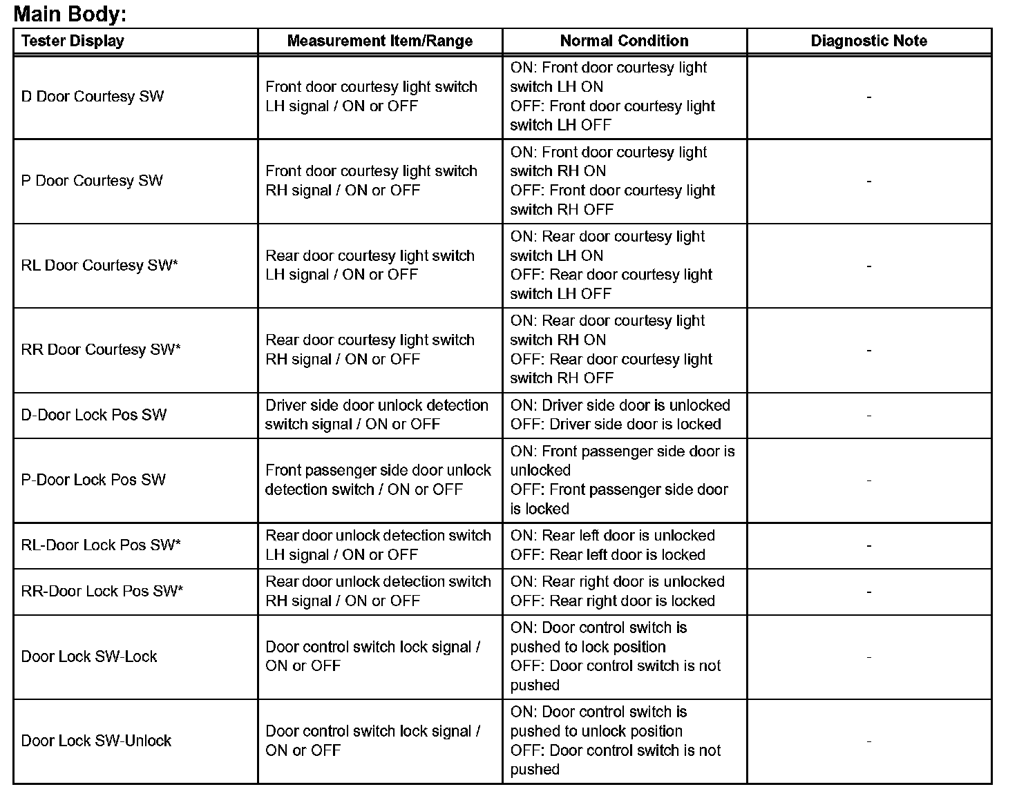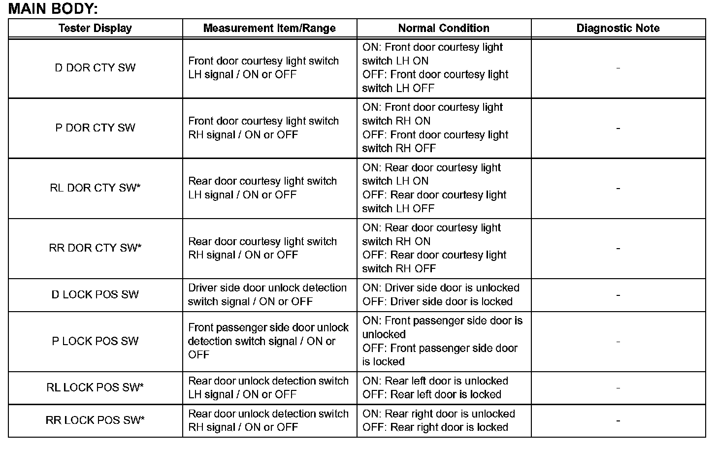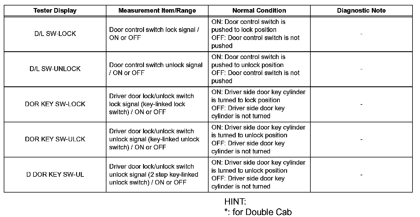READ DATA LISTHINT: Using the intelligent tester or Techstream to read the Data List allows the values or states of switches, sensor, actuators and other items to be read without removing any parts. This non-intrusive inspection can be very useful because intermittent conditions or signals may be discovered before parts or wiring is disturbed. Reading the Data List information early in troubleshooting is one way to save diagnostic time.