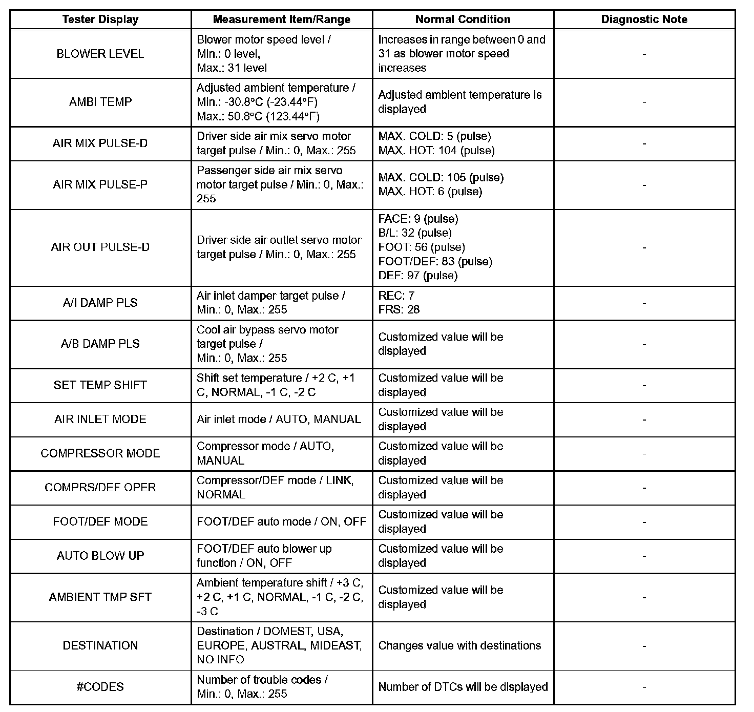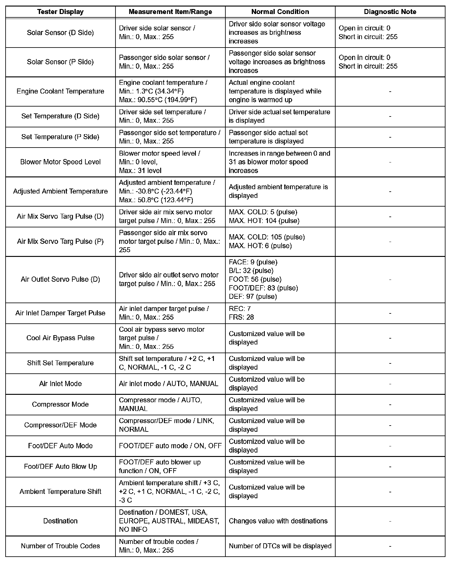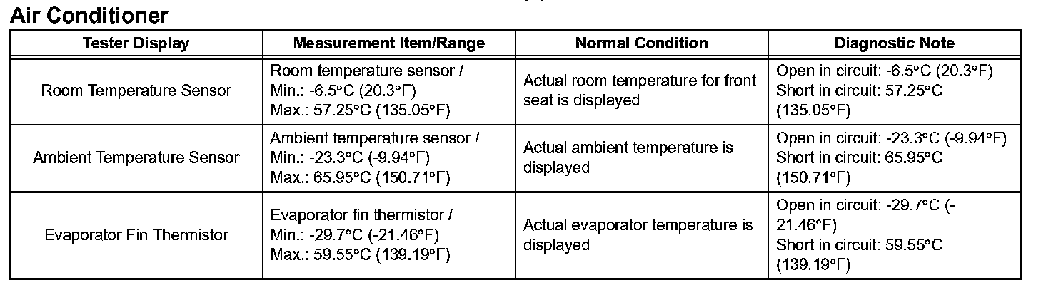 NOTE: In the table given, the values listed under "Normal Condition" are reference values. Do not depend solely on these reference values when deciding whether a part is faulty or not.