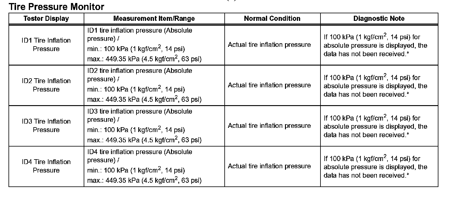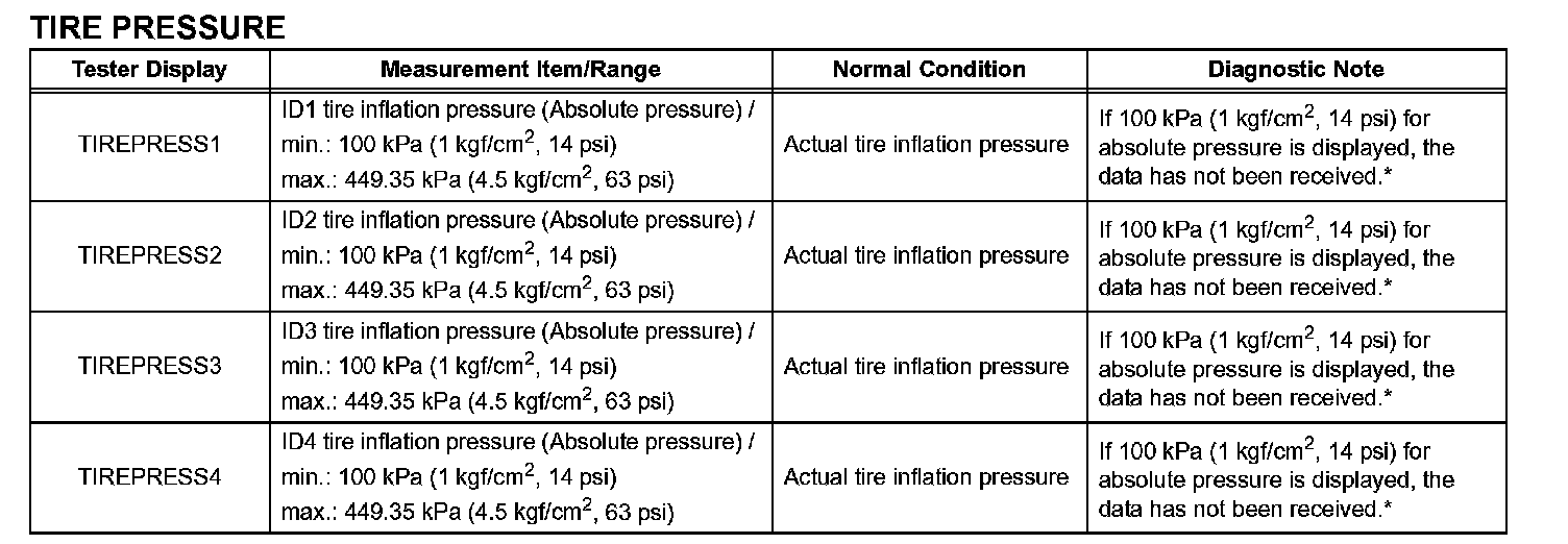 - The initialization is complete when the DATA LIST "TIREPRESS" or "ID Tire Inflation Pressure" display shows the correct pressures.