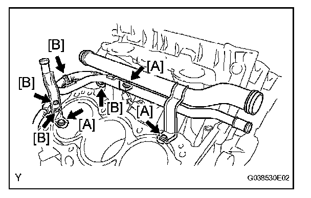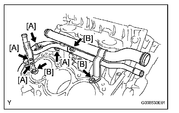 b. Remove the 3 bolts [B] and water outlet pipe.