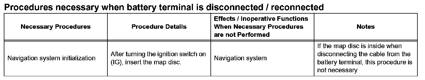 NOTE: After the ignition switch is turned OFF, the navigation system requires approximately 90 seconds to record various types of memory and settings. As a result, after turning the ignition switch OFF, wait 90 seconds or more before disconnecting the cable from the negative (-) battery terminal.