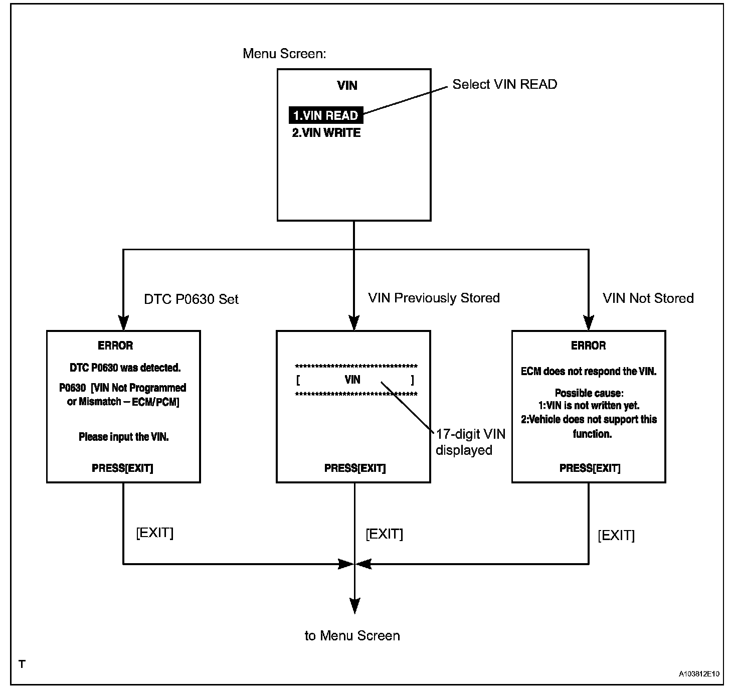 b. Read VIN: Explains the VIN reading process in a flowchart. This process allows the VIN stored in the ECM to be read in order to confirm that the two VINs, provided with the vehicle and stored in the vehicle's ECM, are the same.