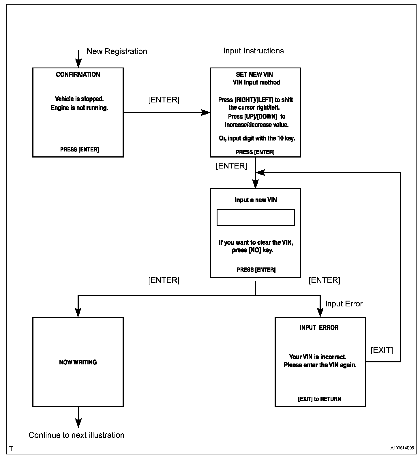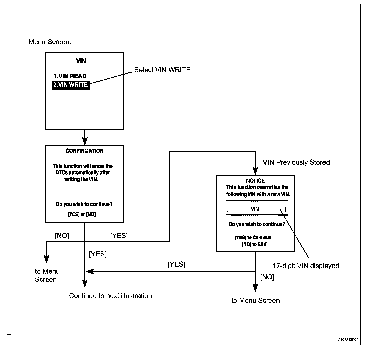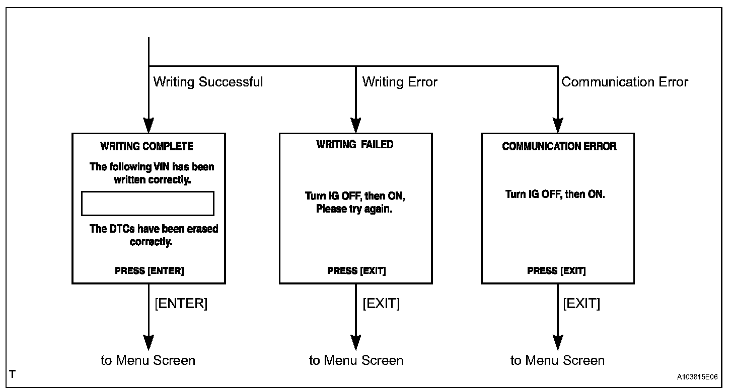 b. Write VIN: Explains the VIN writing process in a flowchart. This process allows the VIN to be input into the ECM. If the ECM is changed, or the ECM VIN and vehicle VIN do not match, the VIN can be registered, or overwritten in the ECM by following this procedure.