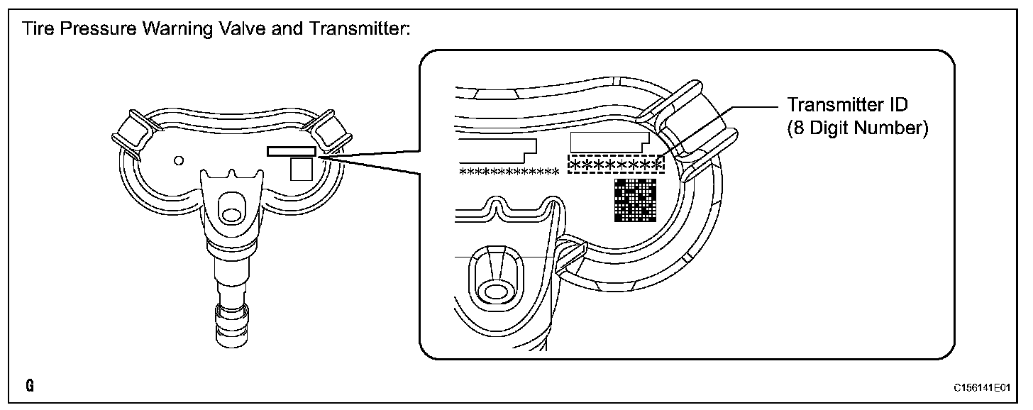 - The transmitter ID is written on the tire pressure warning valve and transmitter. It will be unable to be read after installing the tire pressure warning valve and transmitter on the tire and wheel. Therefore, take a note of the transmitter ID before installing the tire pressure warning valve and transmitter.