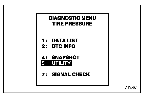 e. Enter the menu items in this order: DIAGNOSIS / OBD/MOBD / CHASSIS / TIRE PRESSURE. Then, select the "UTILITY" item, and press "ENTER" to move to the next screen.