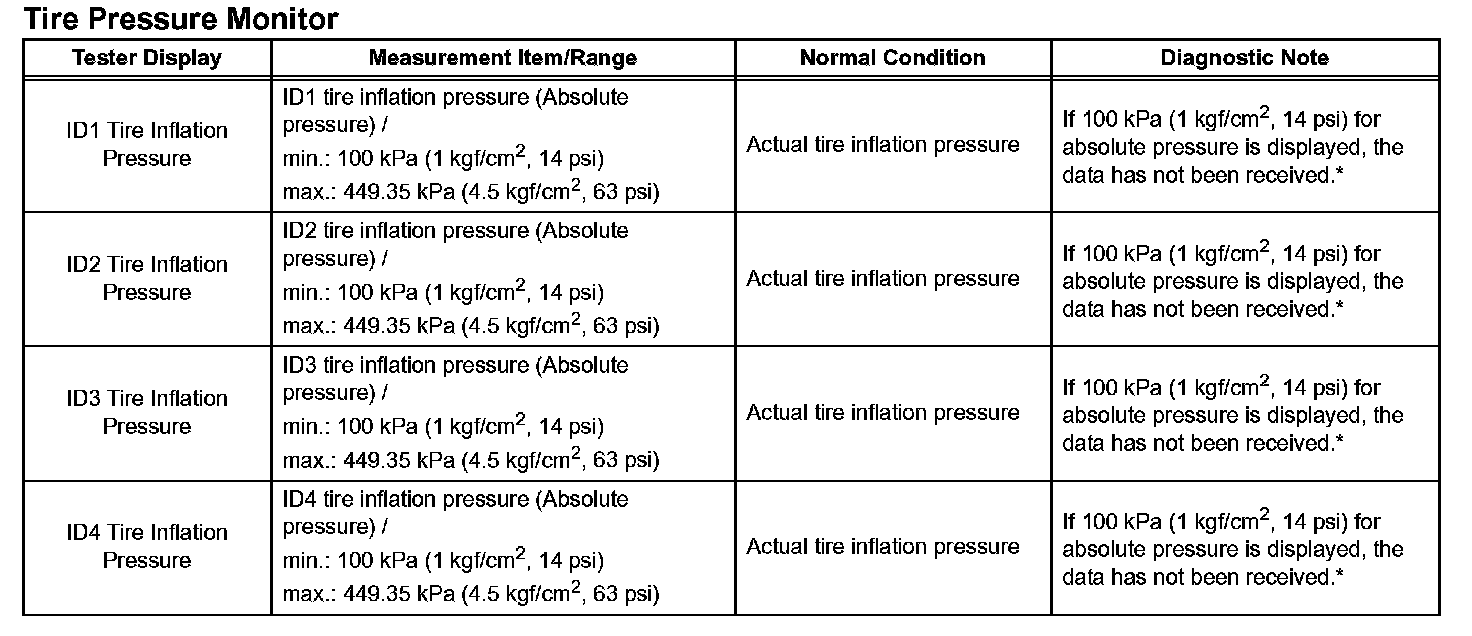 3. Read the "ID Tire Inflation Pressure" values.