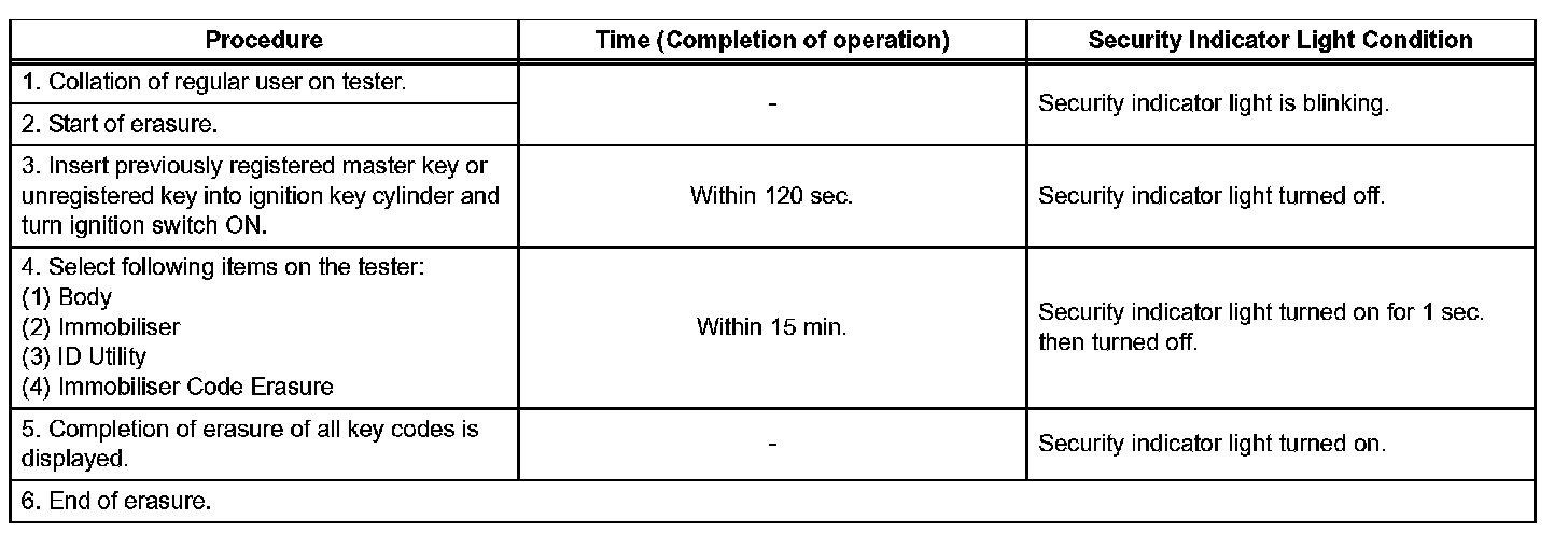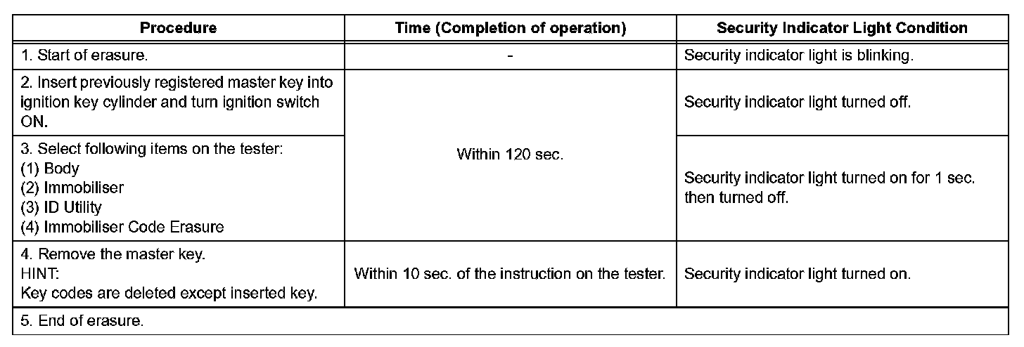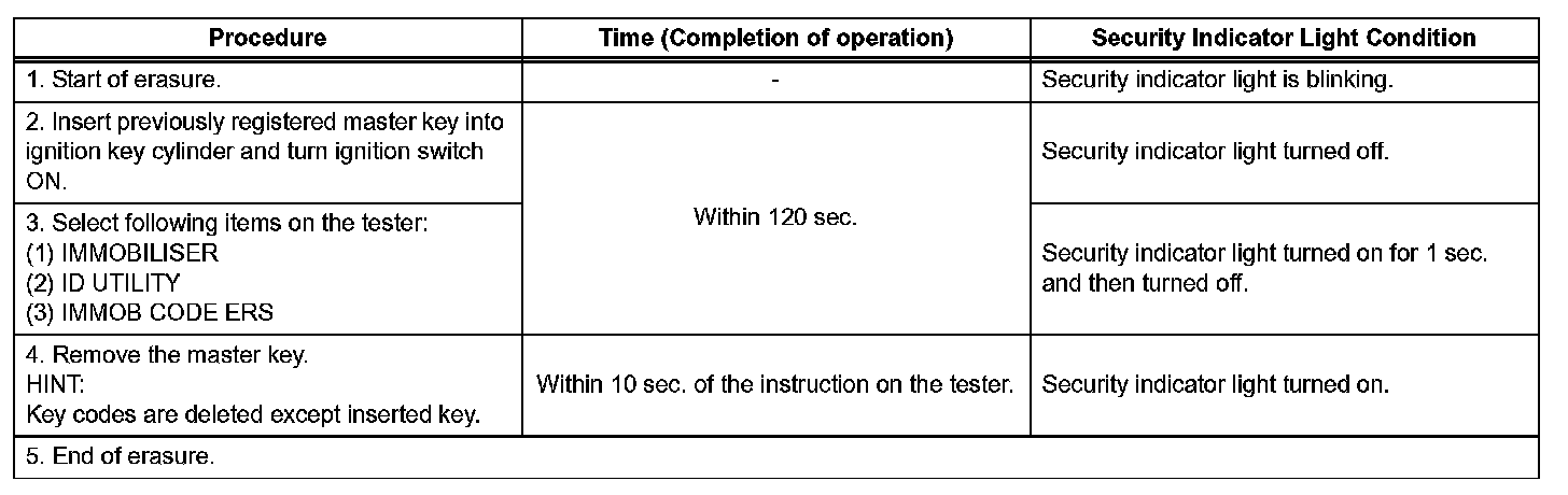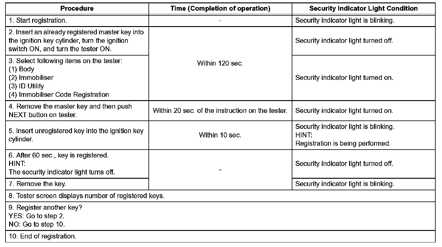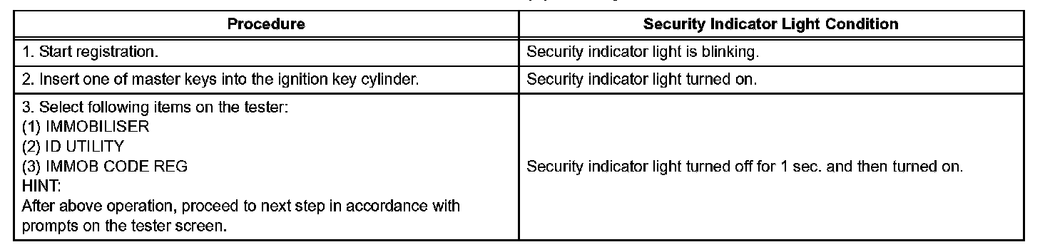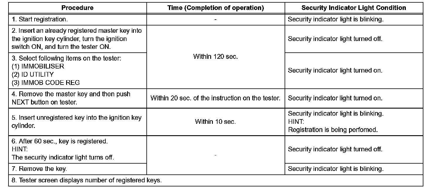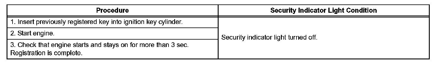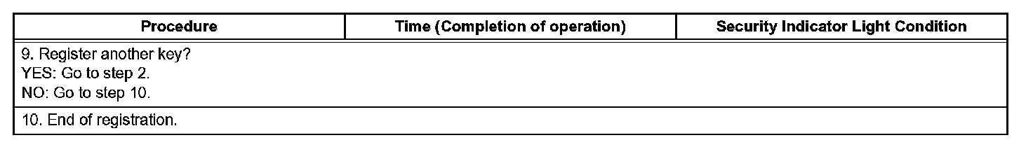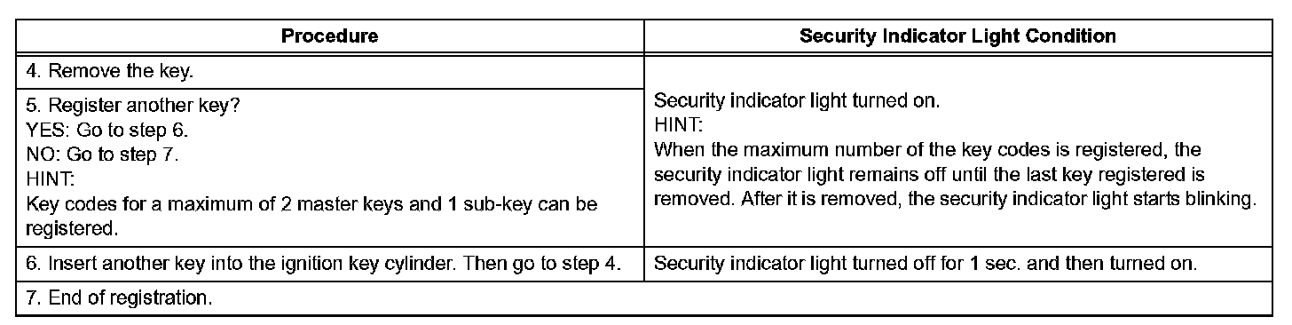 1. Turn the ignition switch ON and OFF 5 times within 10 seconds using a master key that has already been registered.