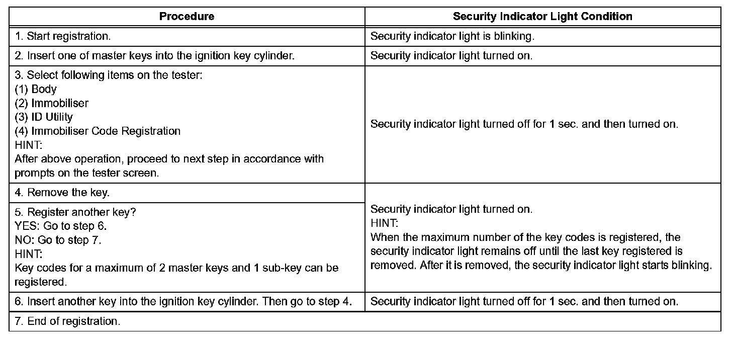 - In this mode, a maximum of 3 key codes for 2 master keys and 1 sub-key can be registered. The master keys and sub-key can be registered in any order because the transponder key ECU can distinguish between different types of keys.