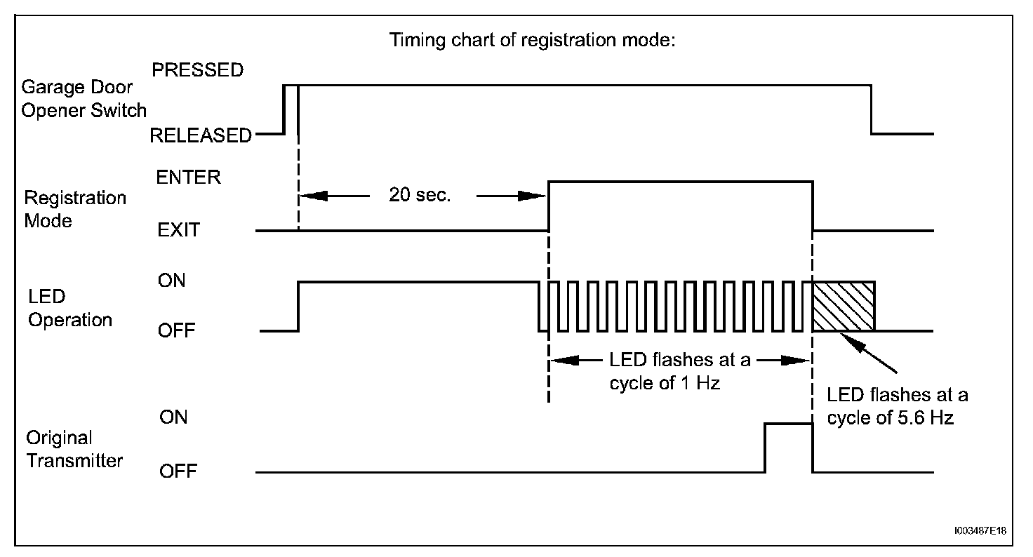 HINT: Before entering registration mode, the LED illuminates. After entering registration mode, the LED flashes at a cycle of 1 Hz. For a "rolling code" type system, after entering registration mode, the LED flashes at a cycle of 8.8 Hz for 1.6 seconds, and then the LED flashes at a cycle of 1 Hz.