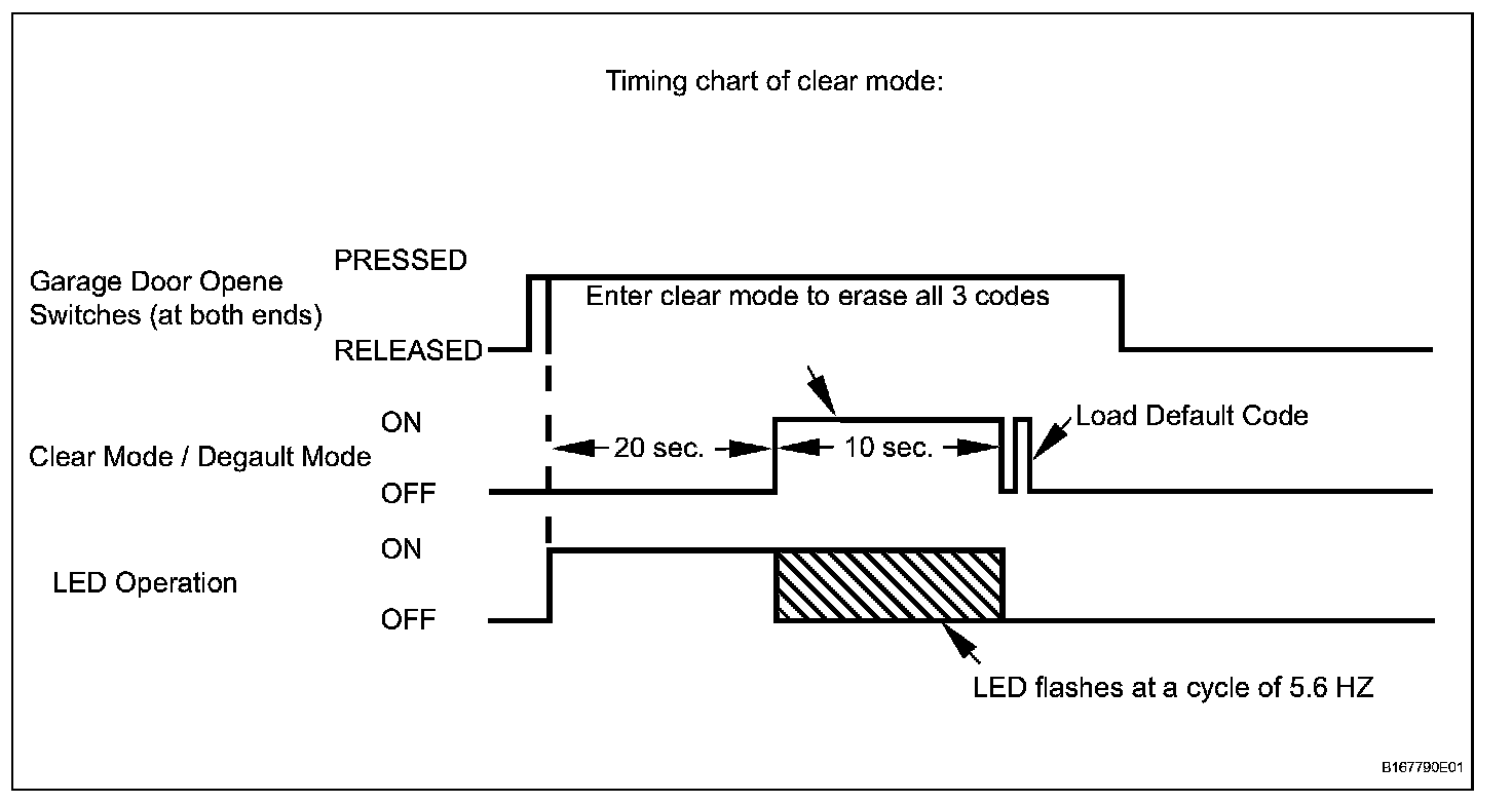 1. Press and hold the left and right switches of the garage door opener for 20 seconds. The LED will begin to flash at a cycle of 5.6 Hz. Releasing the switches will end clear mode.
