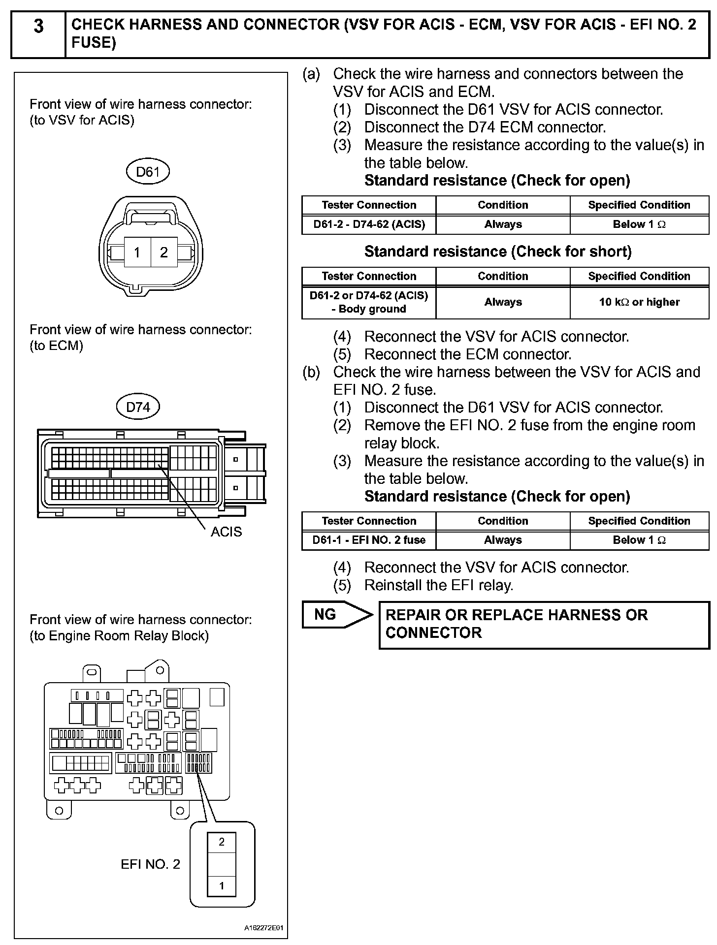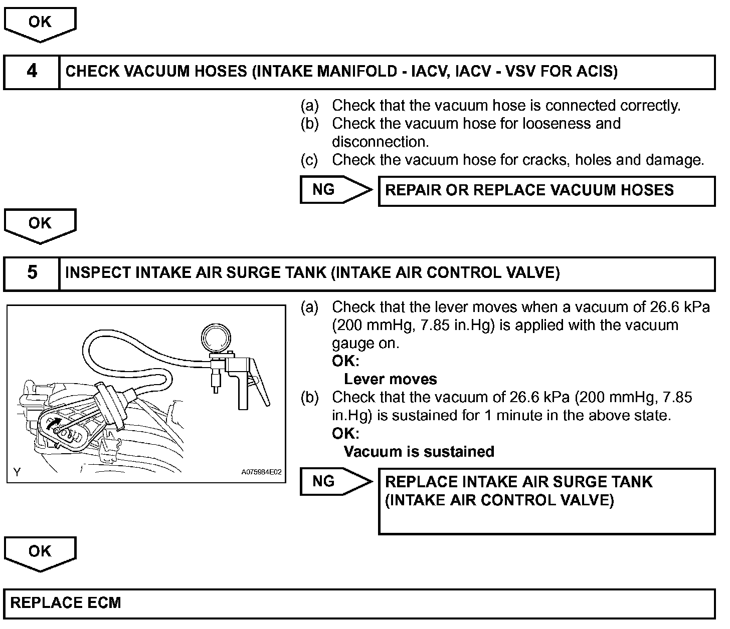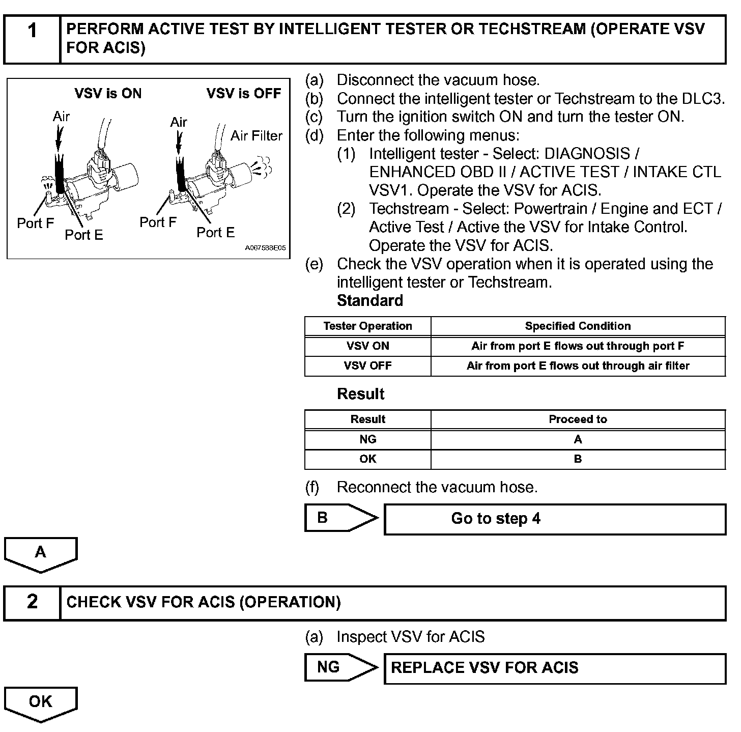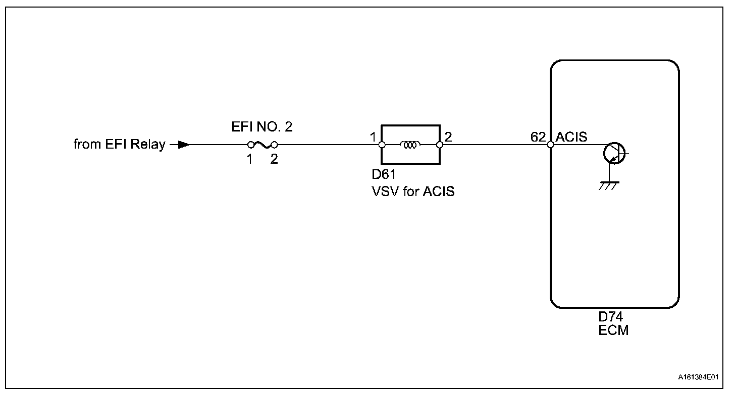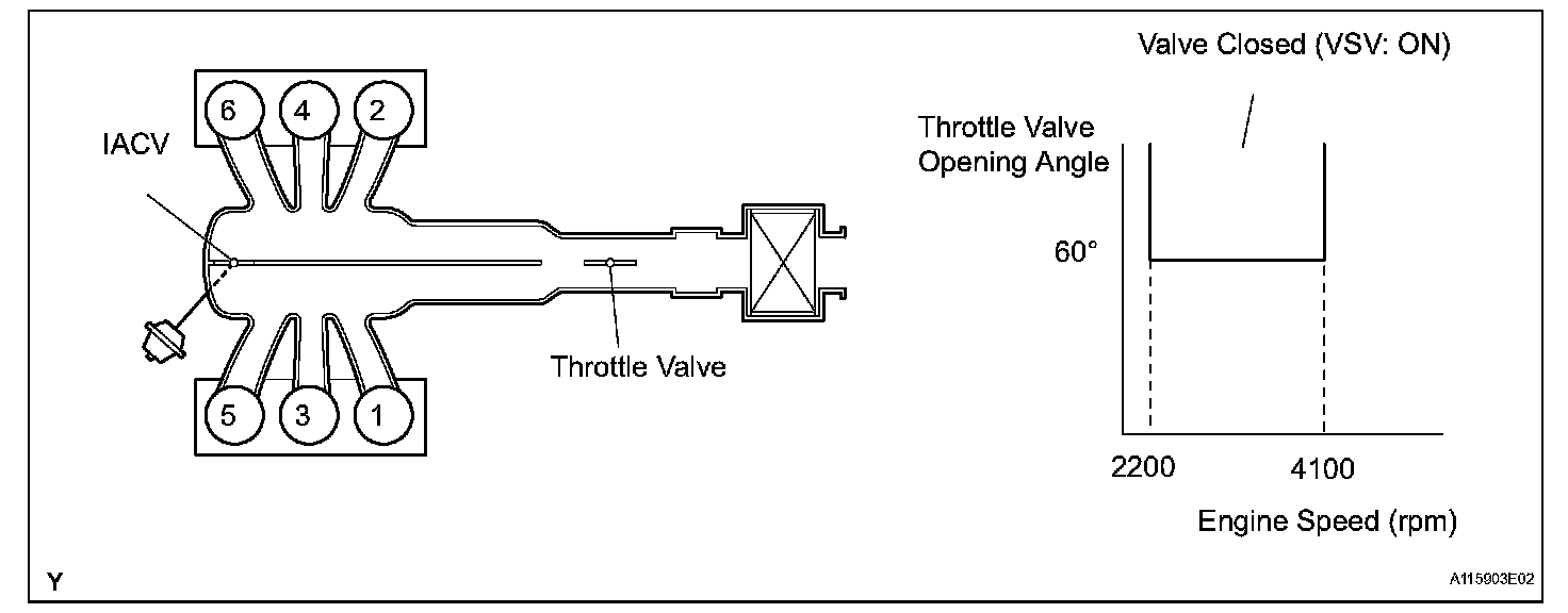 This circuit opens and closes the Intake Air Control Valve (IACV) in response to changes in the engine load in order to increase the intake efficiency (ACIS: Acoustic Control Induction System). When the engine speed is between 2200 rpm and 4100 rpm and the throttle valve opening angle is 60 ° or more, the ECM supplies current to the VSV (ON status), to close the IACV. Under other conditions, the VSV is usually OFF and the IACV is open.