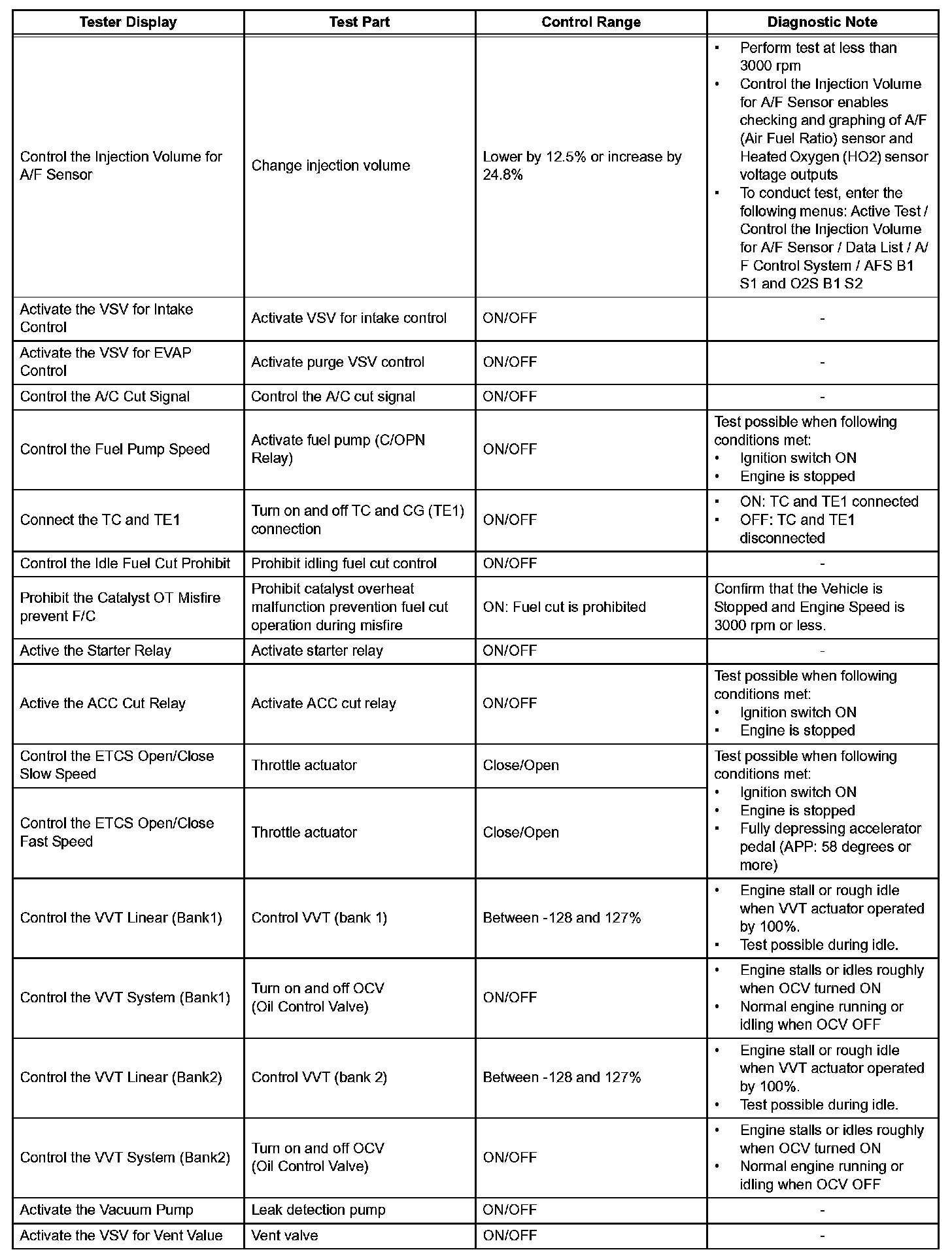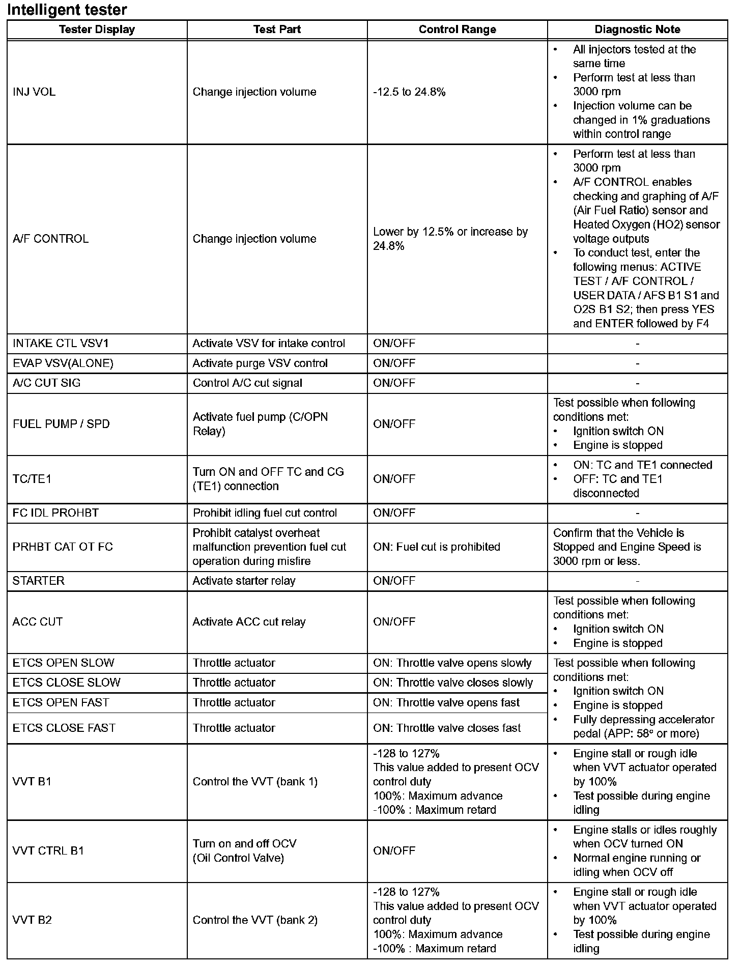 ACTIVE TESTHINT: Using the intelligent tester or Techstream to perform the Active Tests allows relays, VSVs and actuators and other items to be operated without removing any parts. This non-intrusive functional inspection can be very useful because intermittent operation may be discovered before parts or wiring is disturbed. Performing Active Tests early in troubleshooting is one way to save diagnostic time. Data List information can be displayed while performing Active Tests.