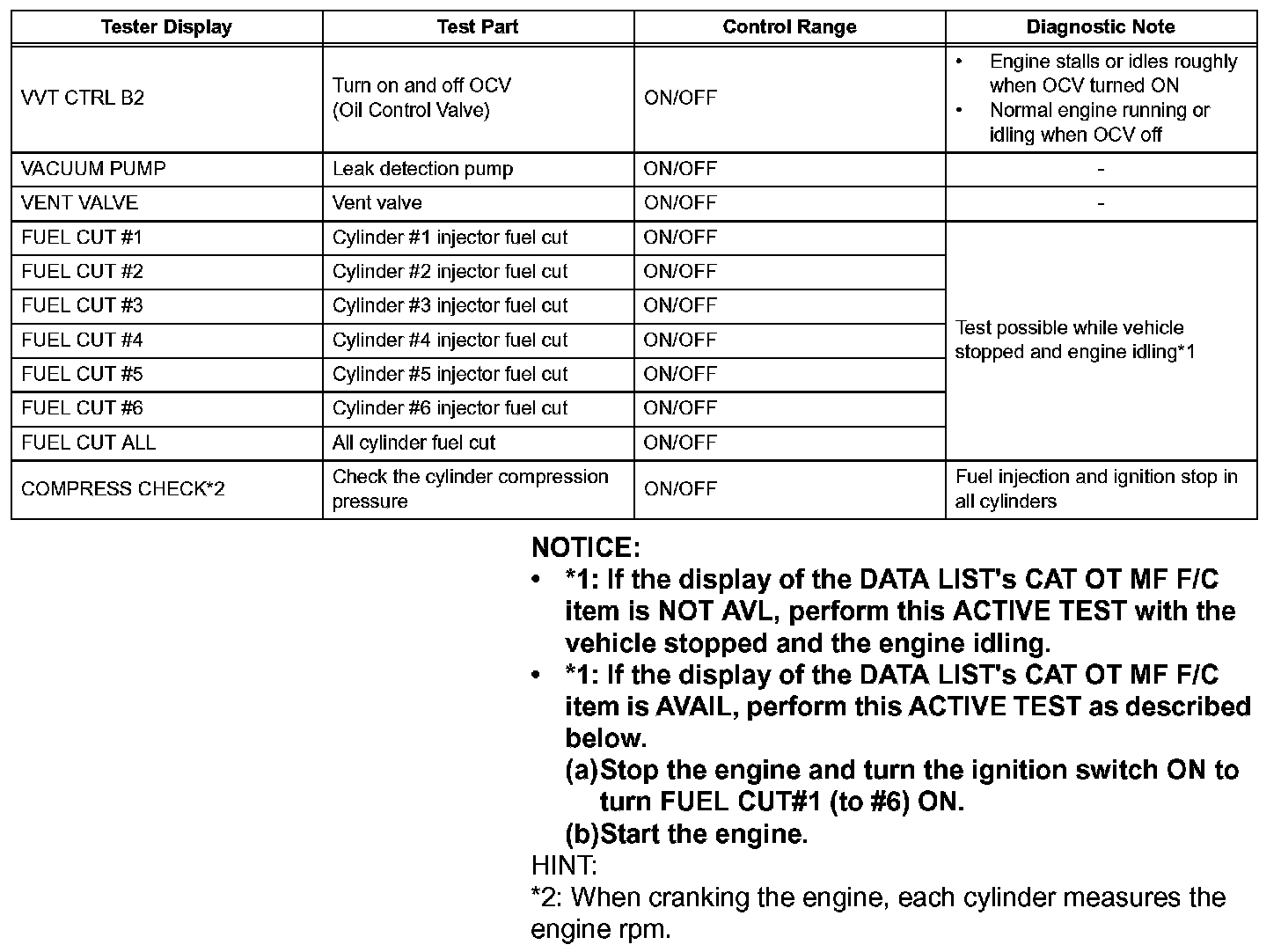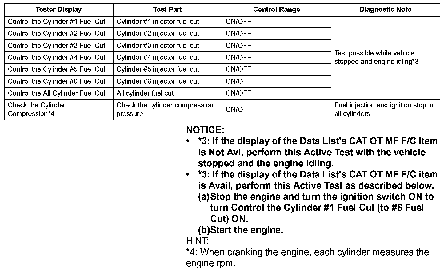 HINT: If the results are not displayed normally, select the display items from the Data List before performing the Active Test. Enter the following menus: Powertrain / Engine and ECT / Data List / Compression / Engine Speed of Cyl #1, Engine Speed of Cyl #2, Engine Speed of Cyl #3, Engine Speed of Cyl #4, Engine Speed of Cyl #5, Engine Speed of Cyl #6 and Av Engine Speed of All Cyl.