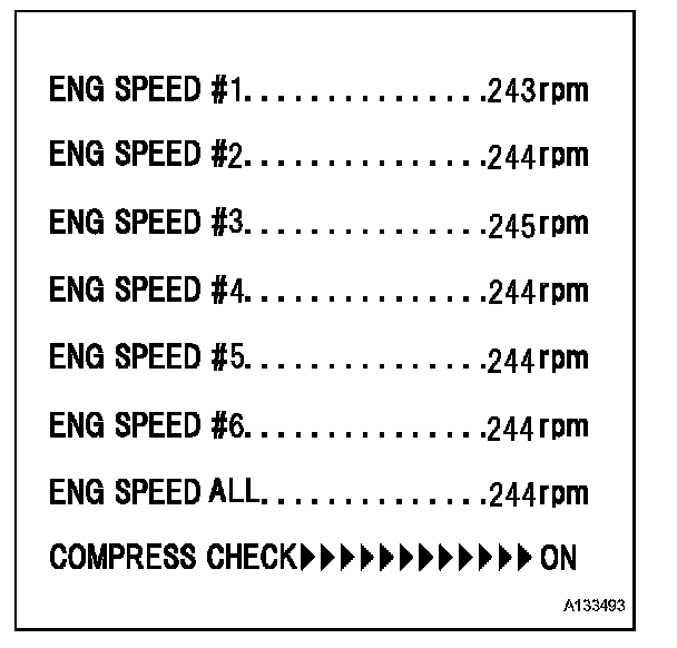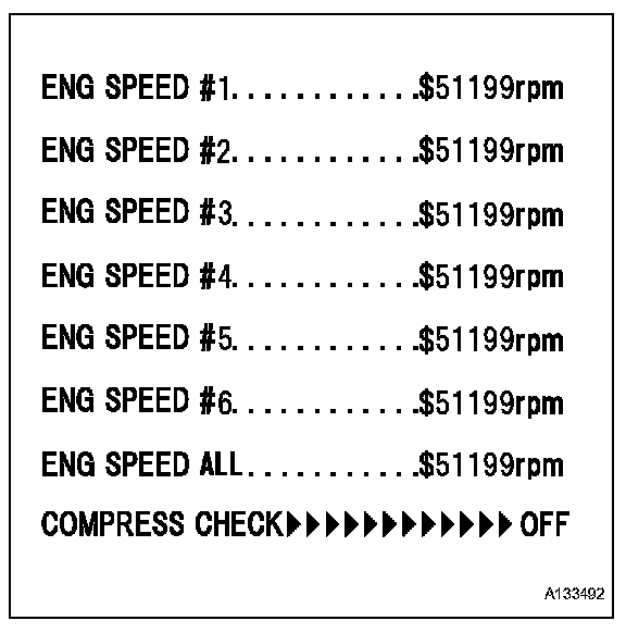 HINT: After performing the procedure, the ACTIVE TEST's COMPRESS CHECK will start. Fuel injection for all cylinders is prohibited, and each cylinder's engine rpm measurement will enter standby mode.
