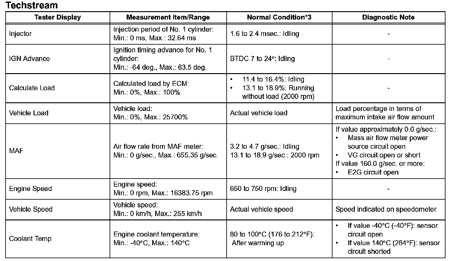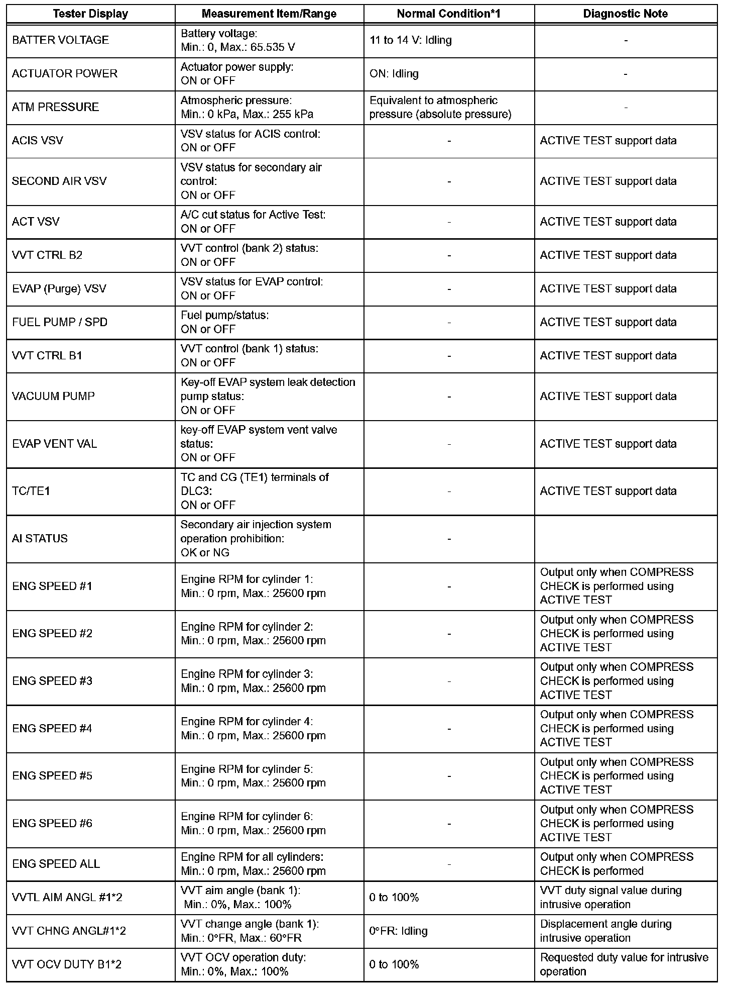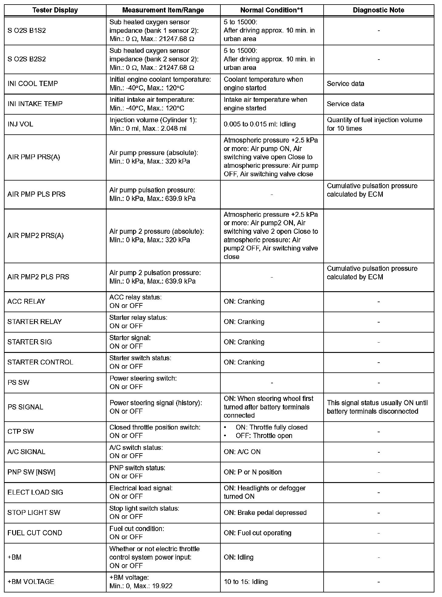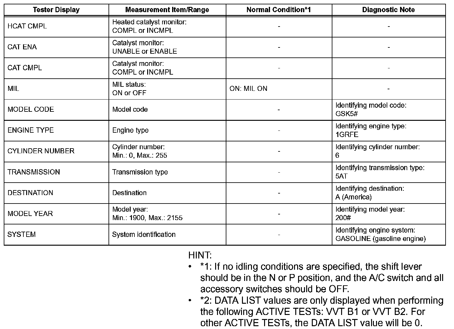 DATA LISTHINT: Using the intelligent tester or Techstream to read the Data List allows the values or states of switches, sensors, actuators and other items to be read without removing any parts. This non-intrusive inspection can be very useful because intermittent conditions or signals may be discovered before parts or wiring is disturbed. Reading the Data List information early in troubleshooting is one way to save diagnostic time
