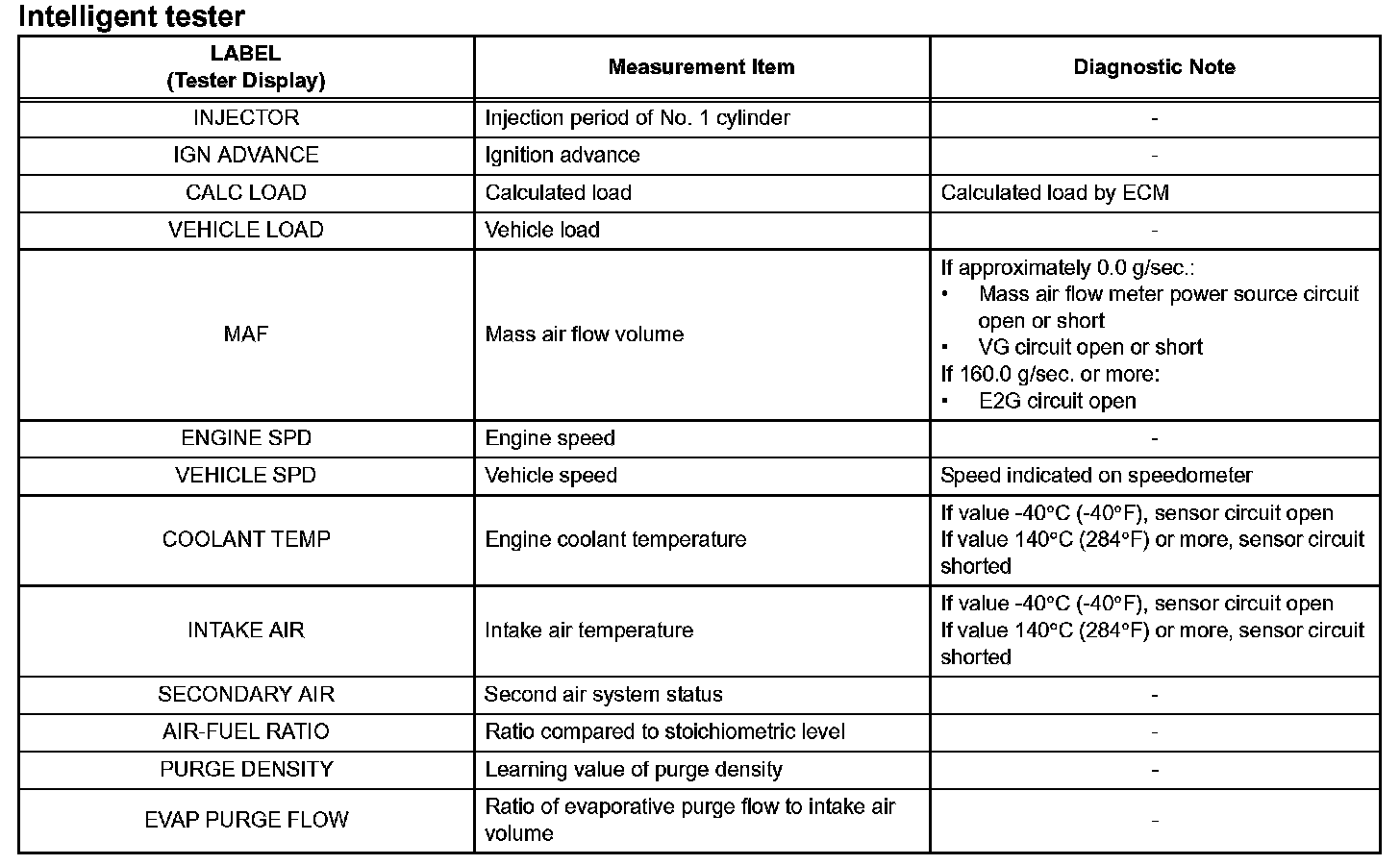 2. LIST OF FREEZE FRAME DATA (Using Intelligent tester)