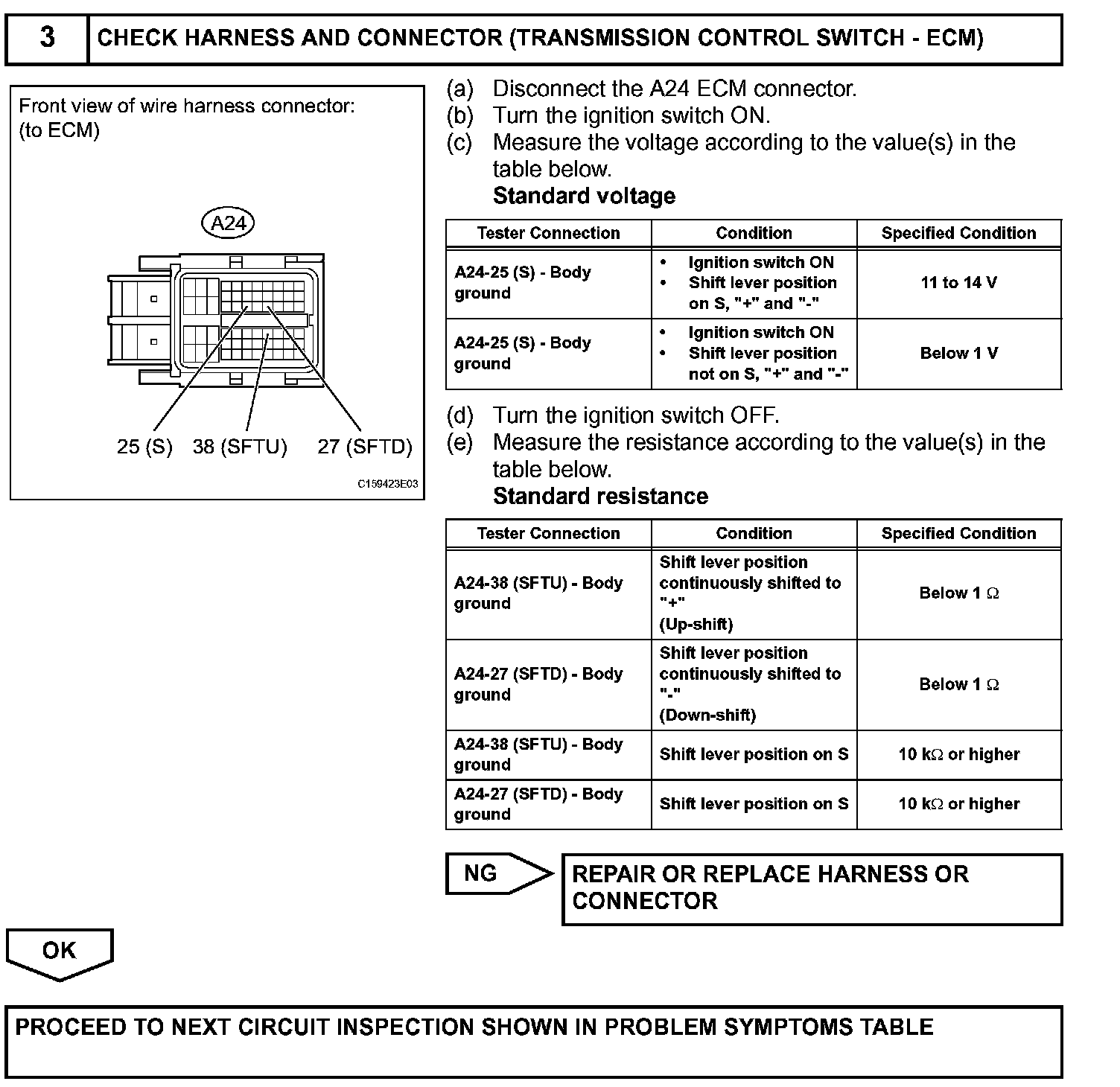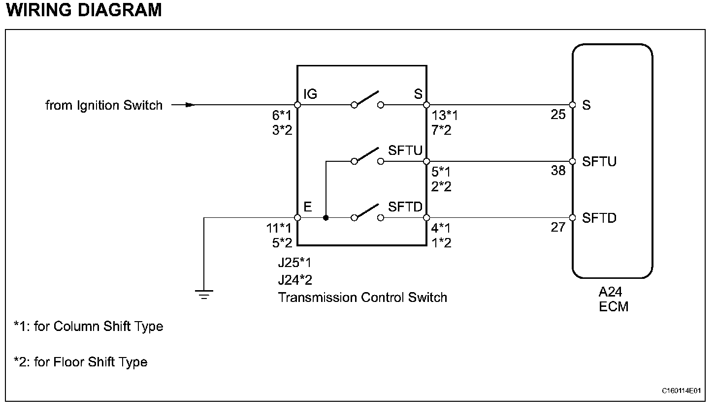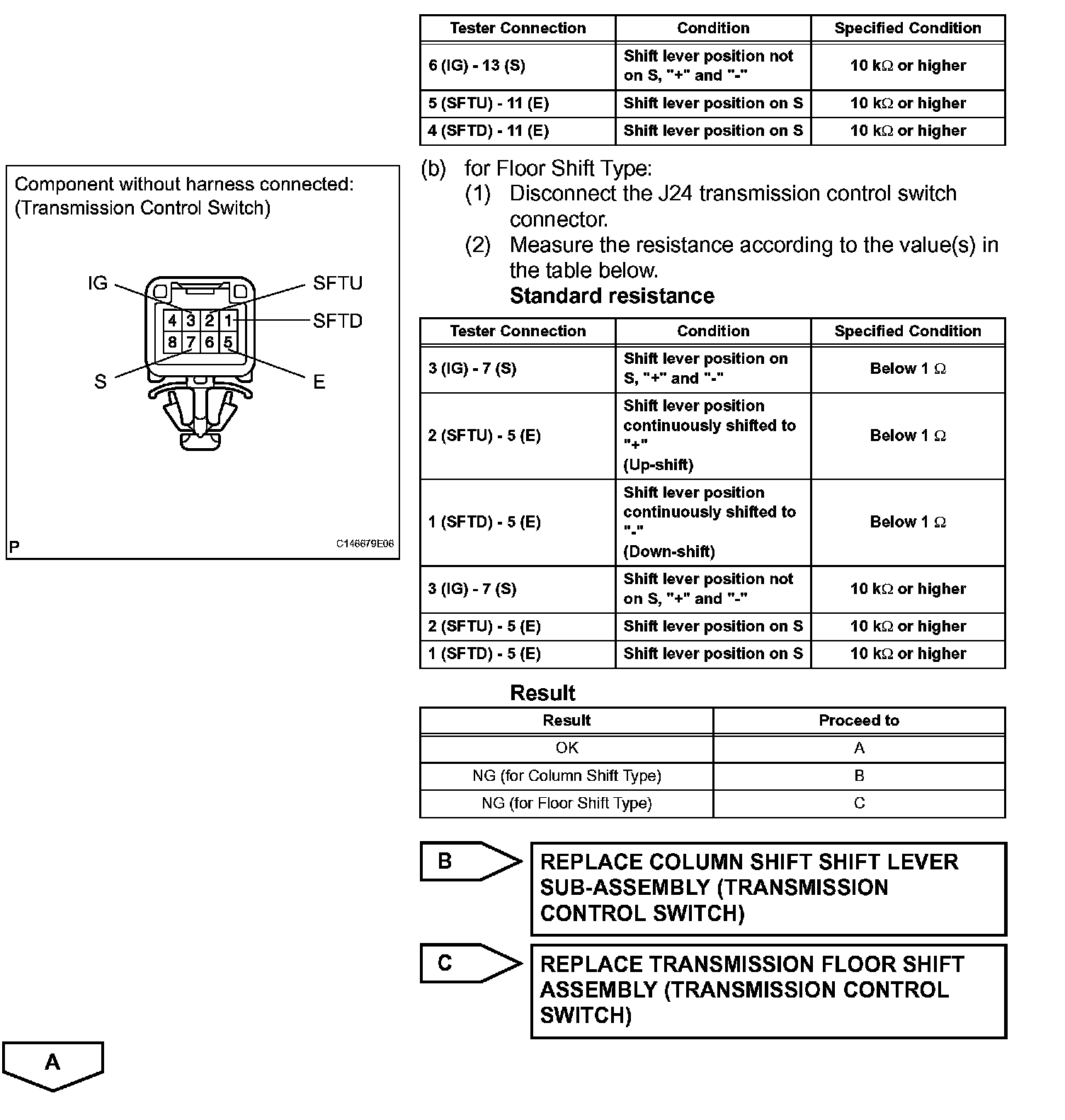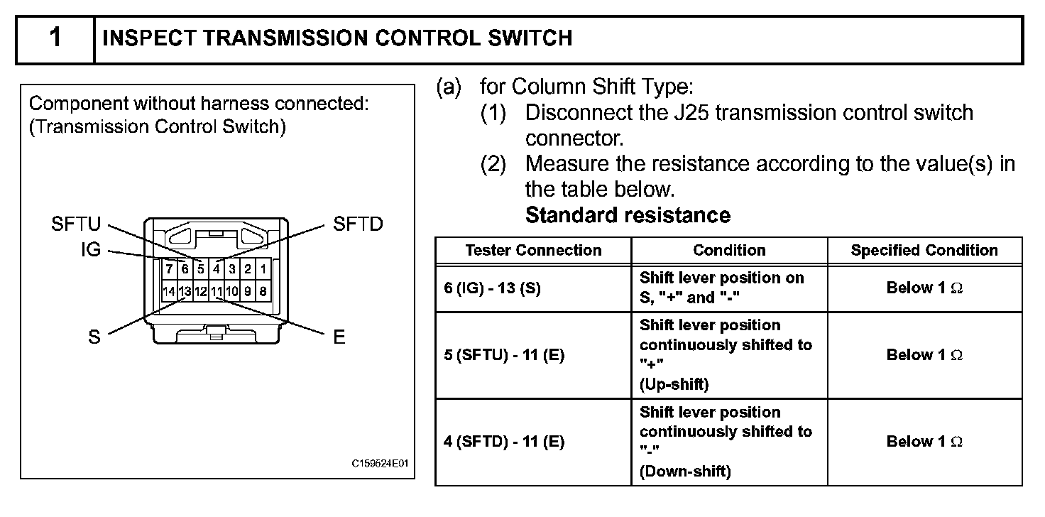 When moving the shift lever into the S position using the transmission control switch, it is possible to switch the shift range position between "1" (1st range) and "5" (5th range). Shifting to "+" once raises the shift range position by one, and shifting to "-" lowers the shift range position by one.