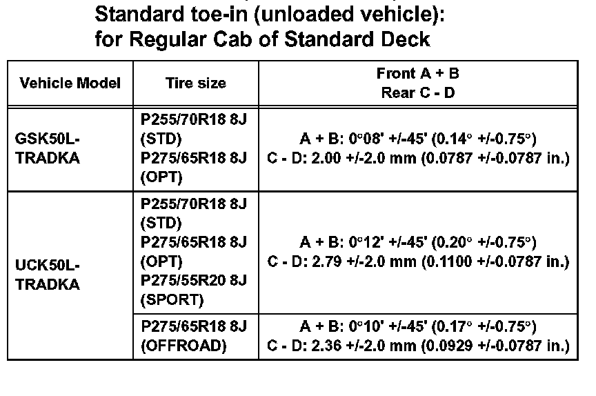 Standard toe-in (unloaded vehicle): for Regular Cab of Standard Deck (Part 1):