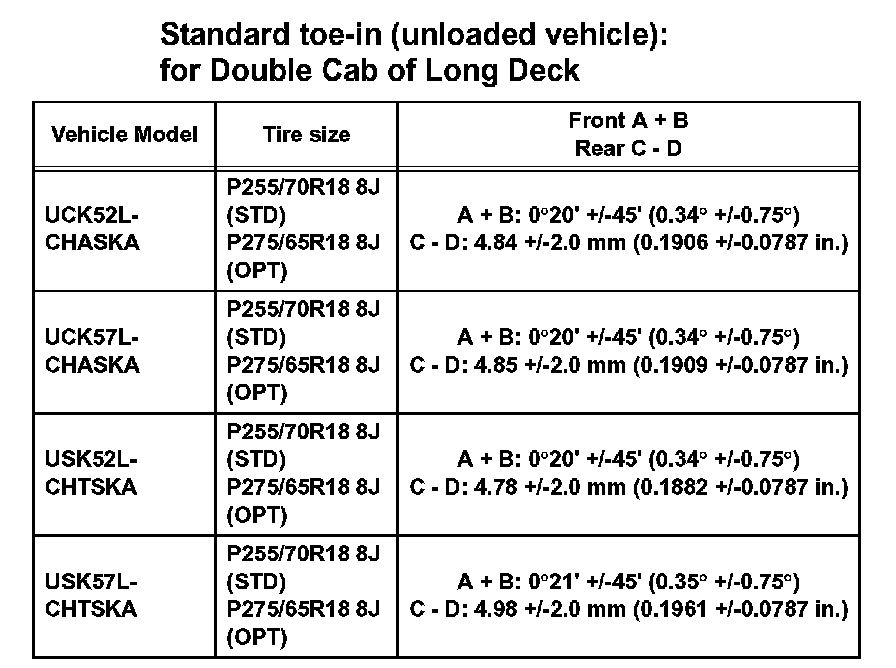 Standard toe-in (unloaded vehicle): for Double Cab of Long Deck: