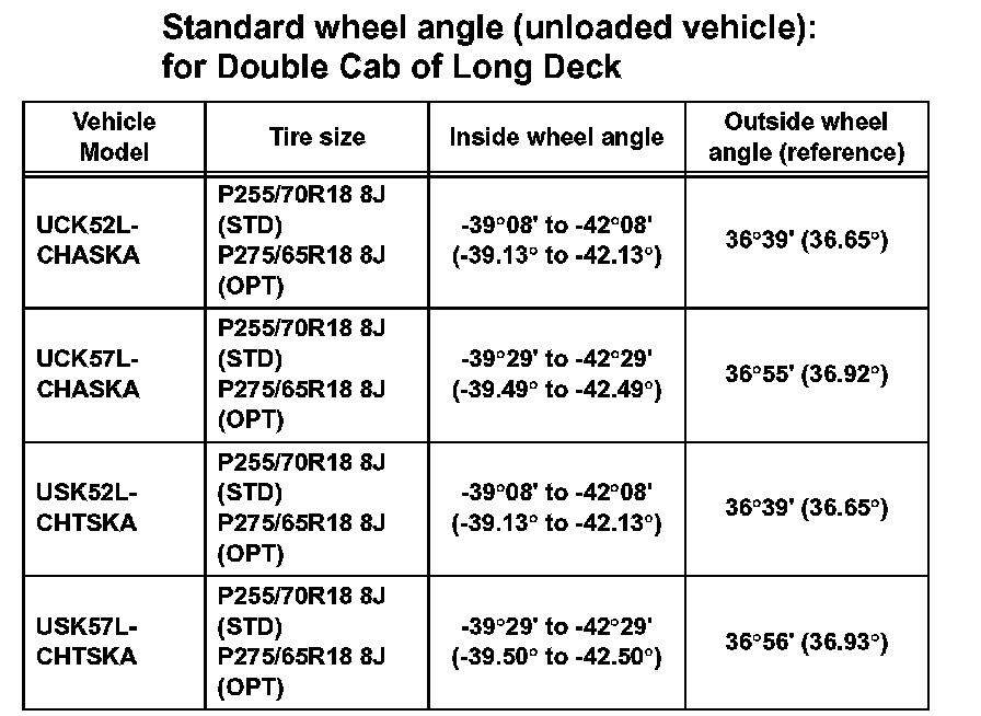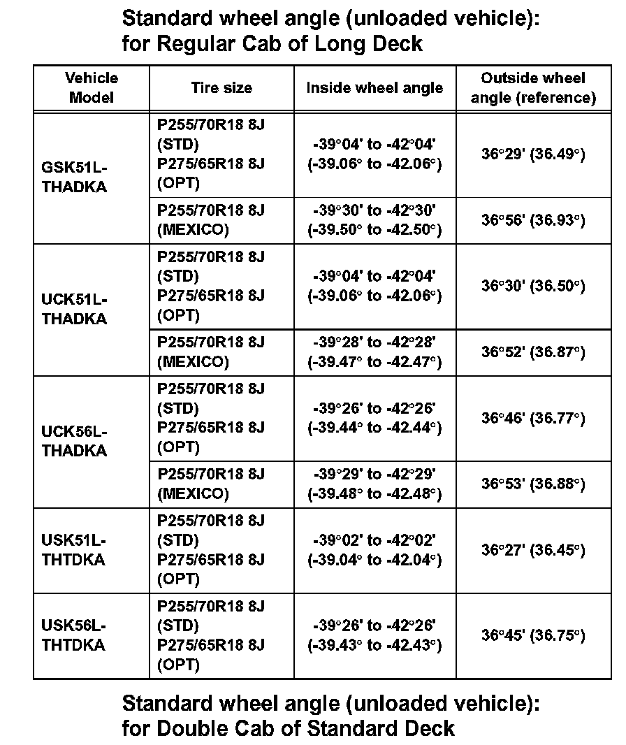 Standard wheel angle (unloaded vehicle): for Regular Cab of Standard Deck (Part 1):