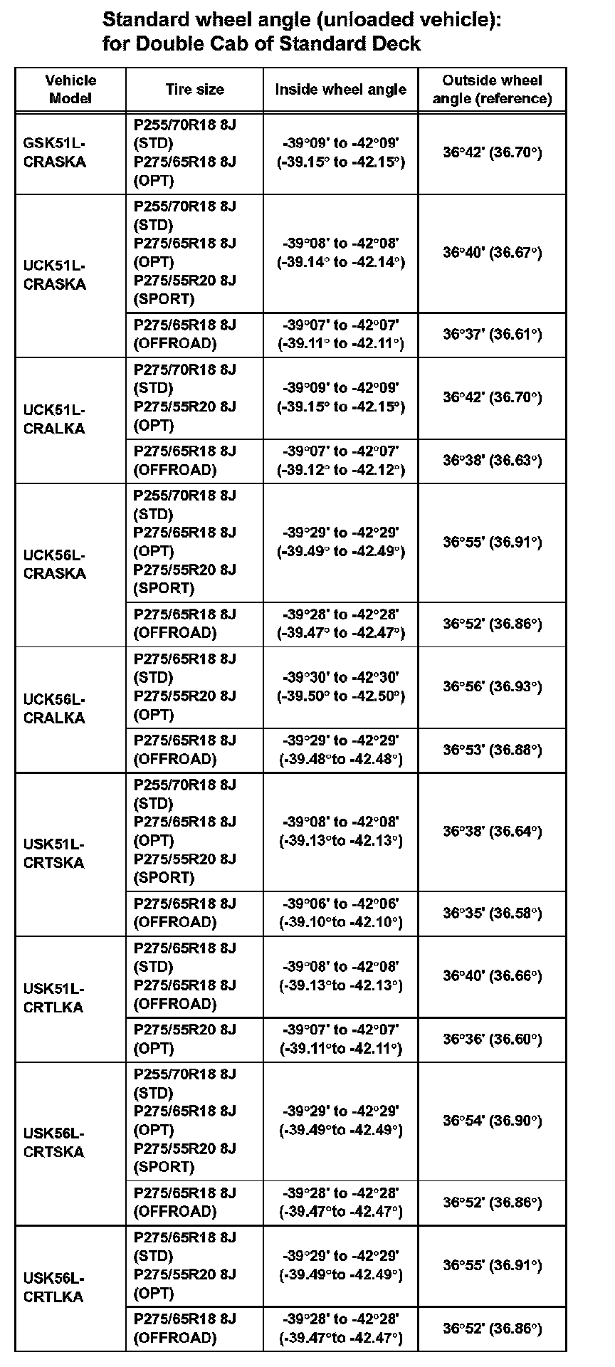 Standard wheel angle (unloaded vehicle): for Double Cab of Standard Deck: