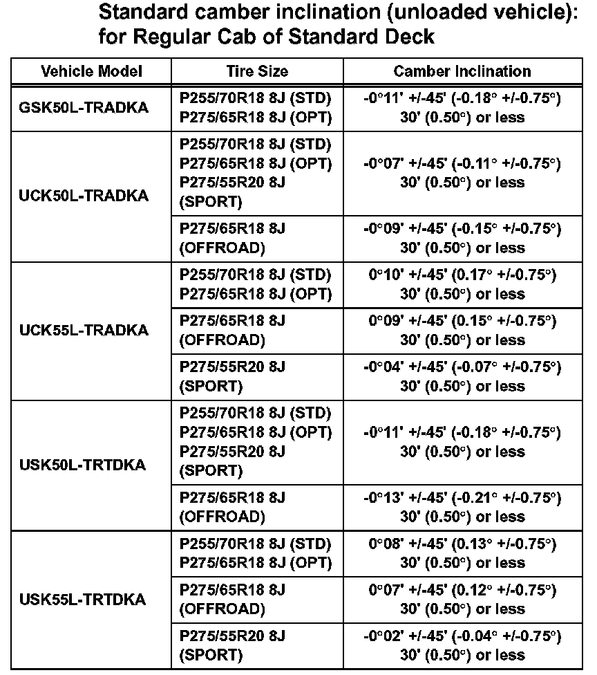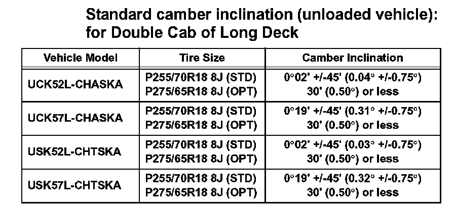Standard camber inclination (unloaded vehicle): for Double Cab of Standard Deck (Part 2):