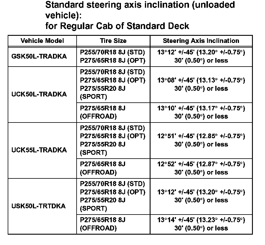 Standard steering axis inclination (unloaded vehicle): for Regular Cab of Standard Deck (Part 2):