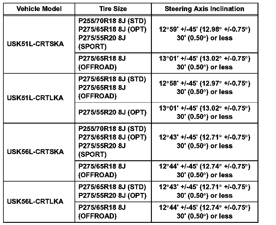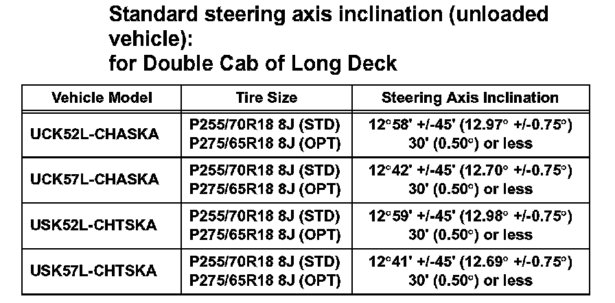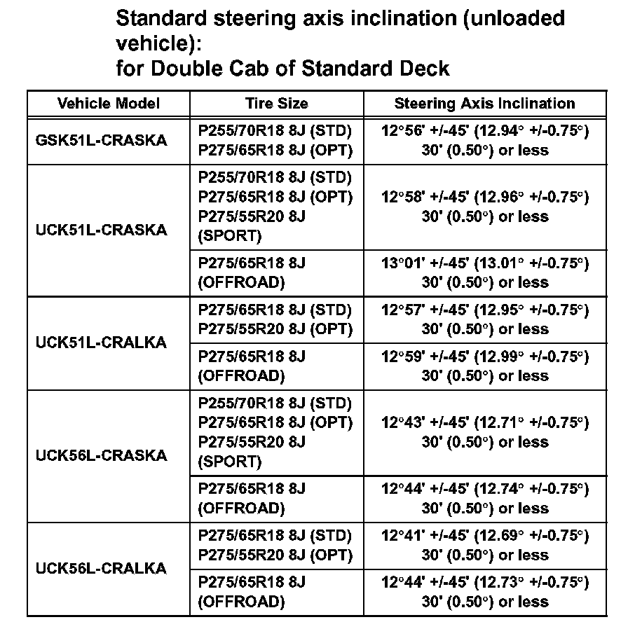 Standard steering axis inclination (unloaded vehicle): for Double Cab of Standard Deck (Part 1):