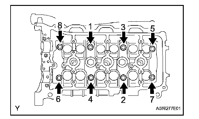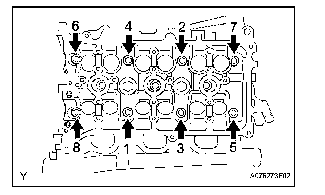 Using a 10 mm bi-hexagon wrench, install and uniformly tighten the 8 cylinder head bolts with the plate washers in several steps in the sequence shown in the illustration.