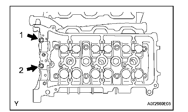Install the 2 cylinder head bolts. Using several steps, tighten the bolts uniformly in the sequence shown in the illustration.