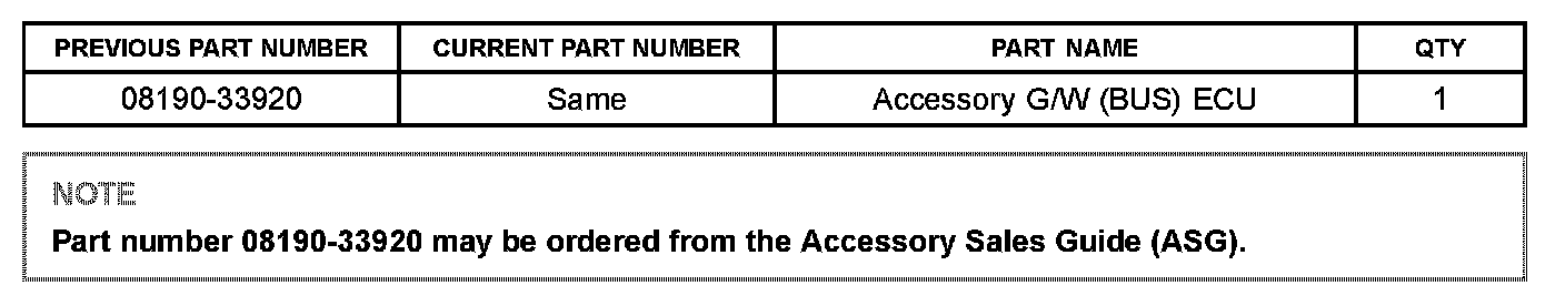 1. Order a NEW Accessory Gateway (BUS) ECU (P/N 08190-33920) from the Accessory Sales Guide (ASG).