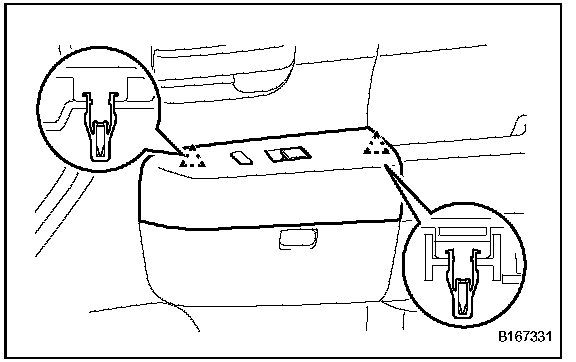 b. Attach the 2 clips to install the front upper armrest base panel RH.
